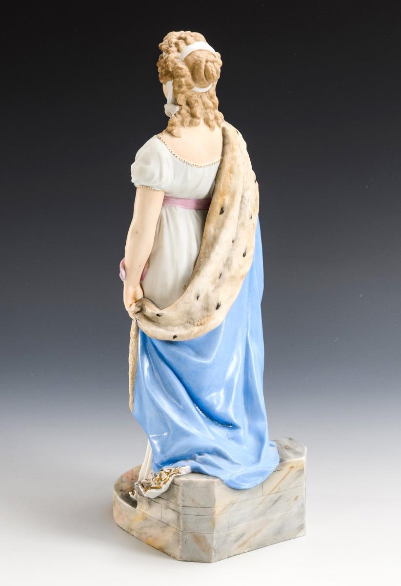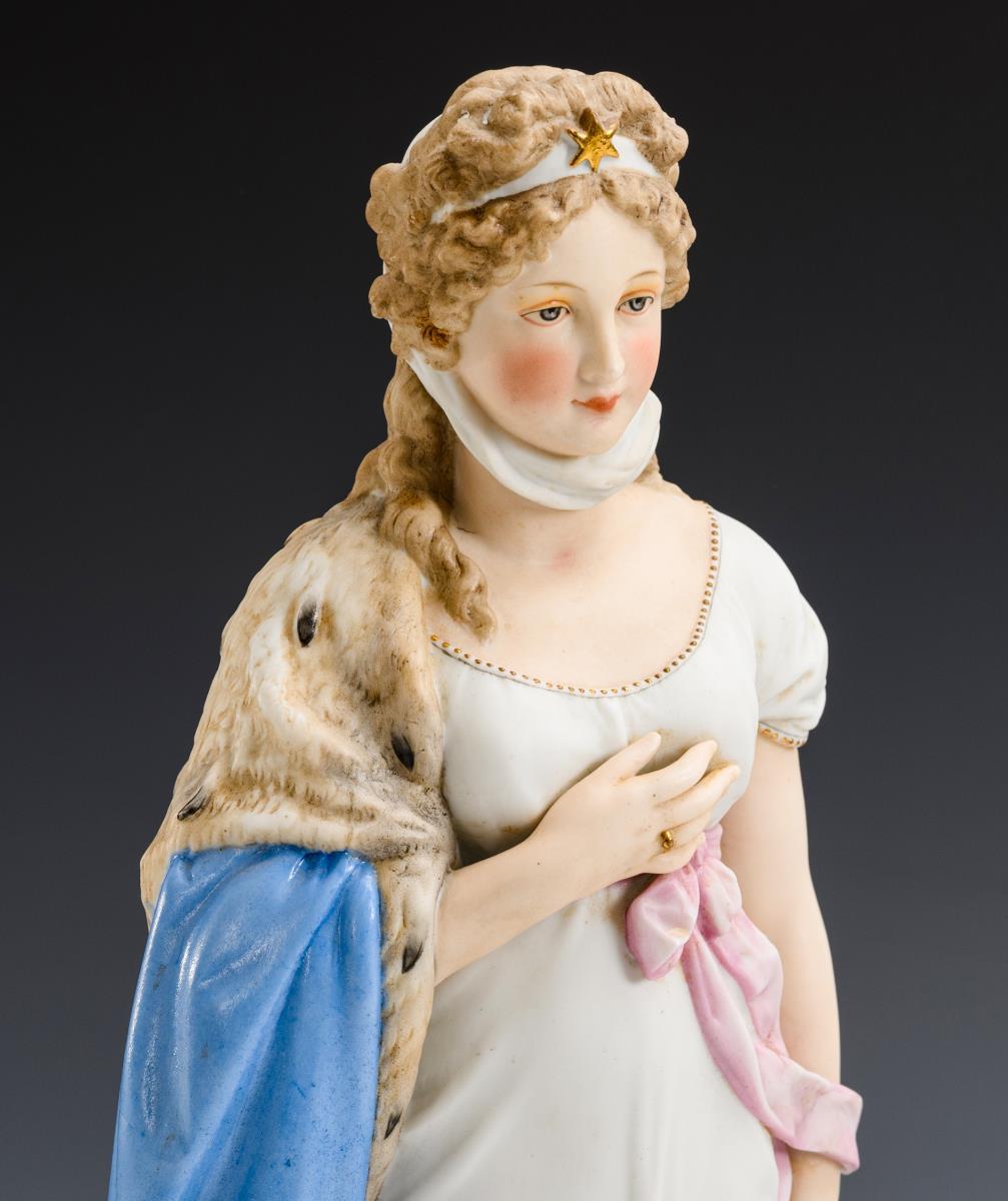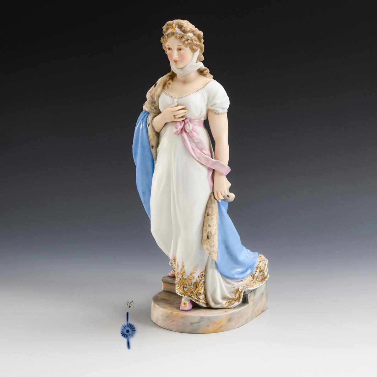 Biskuit-Figur der preußischen Königin Luise, nach einem Gemälde von Gustav Karl Ludwig Richter (1823-1884). Sockelrand minimal bestoßen, Gürtelband und Halstuch bestoßen bzw. restauriert.