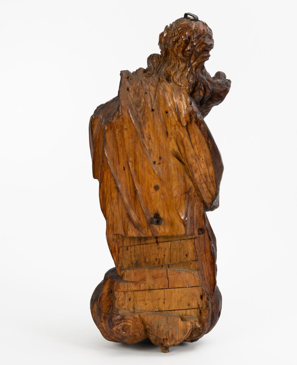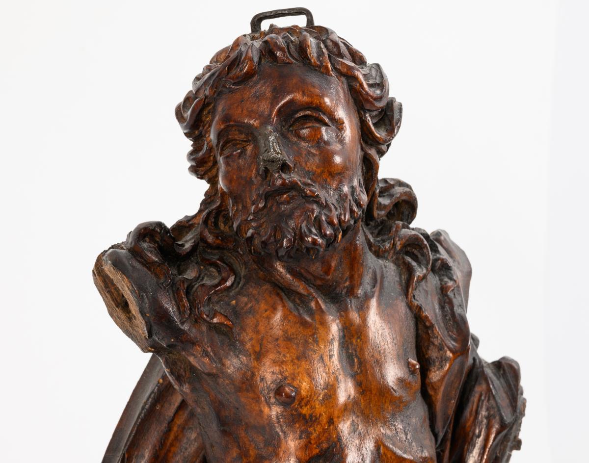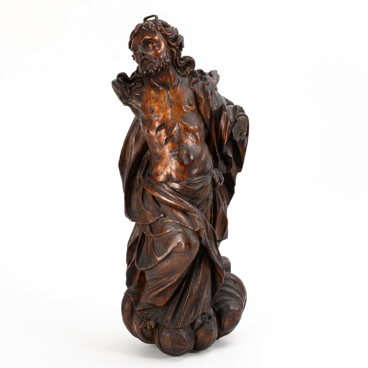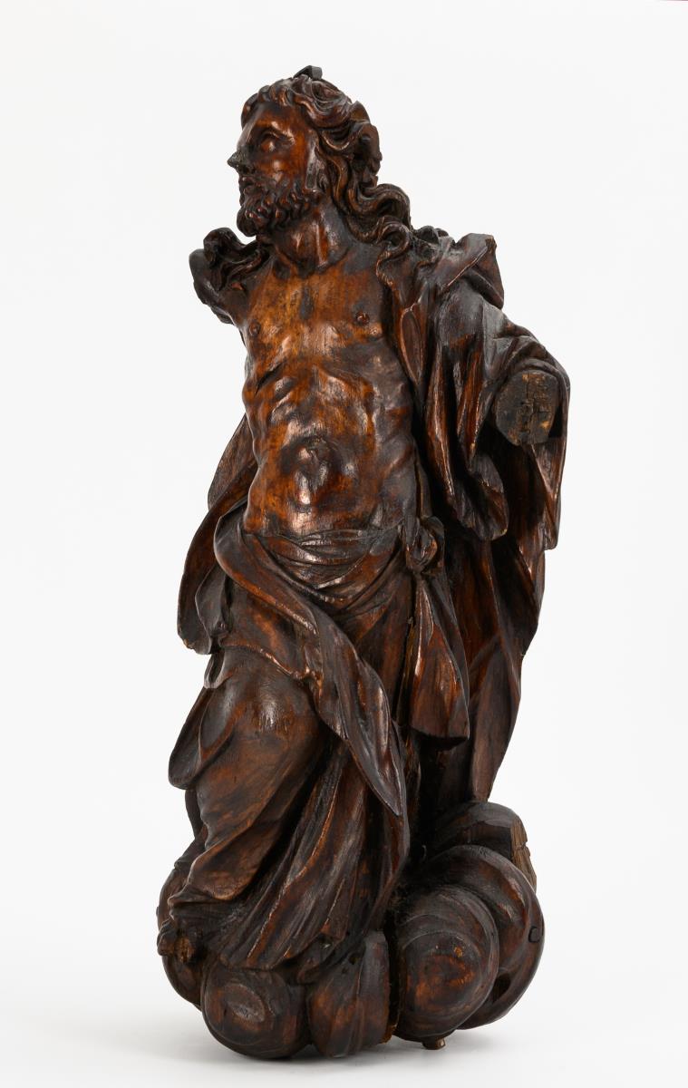 Auf den Wolken stehender Christus mit angewinkeltem Bein und leichter Körperdrehung sowie faltenreichem Gewand, das den Oberkörper freigibt. Arme und 1 Zeh fehlen, Nase ergänzt, Trockenrisse, wohl entfernte Fassung, jünger gebeizt.