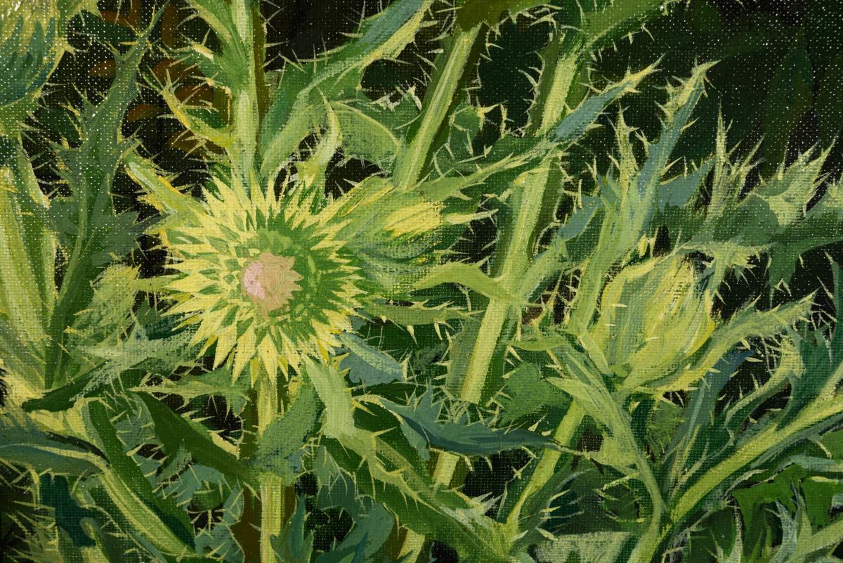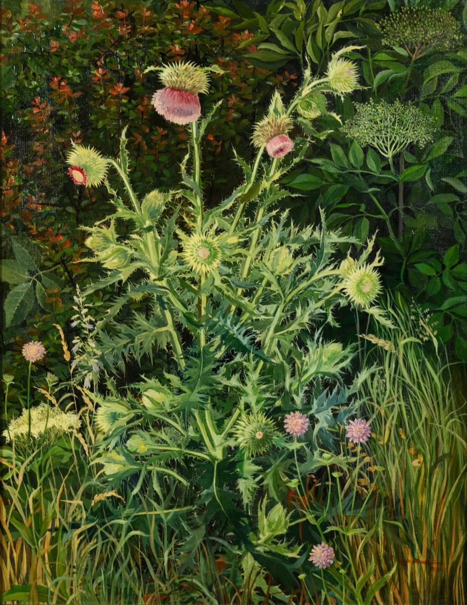Im Stil der Neuen Sachlichkeit gemalte blühende Pflanze in der Wiese vor größeren Gewächsen.
