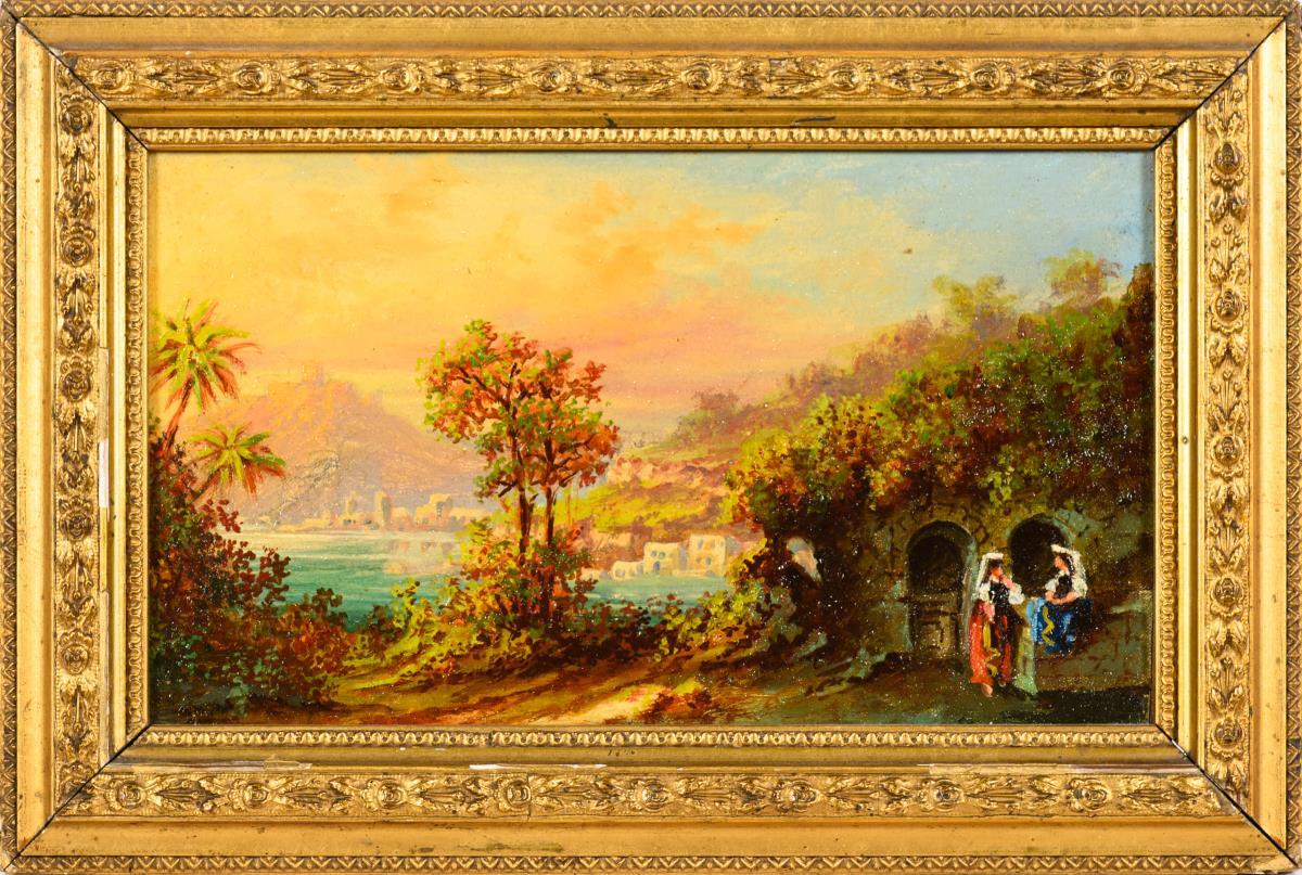 Südliche Gebirgslandschaft mit Staffagefiguren im Sonnenschein mit Blick in die Bucht.