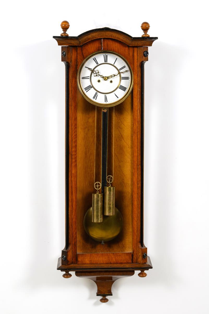 3-seitig verglastes Wanduhrengehäuse mit geschweiftem Giebel, geschrägten Zierkanten und Konsolabschluss mit Drechselknäufen, 2 bekrönende Knäufe. Ziffernblatt mit Defekten, Gehäuse mit Alters- und Gebrauchsspuren, teils rissig, mit Ergänzungen.