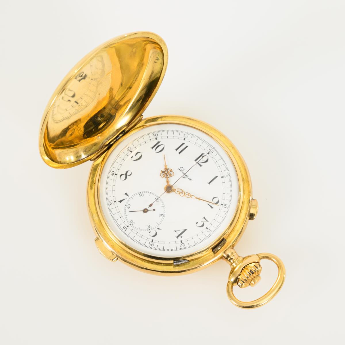 Goldene Savonnette mit Minutenrepetition und Chronograph. Lega.