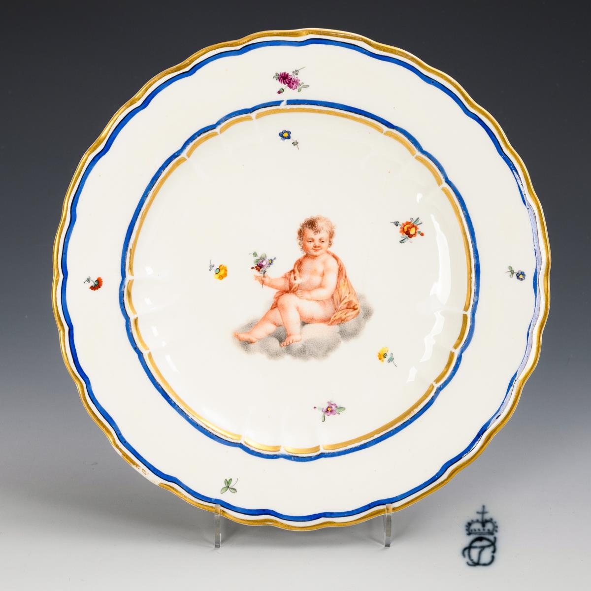 Speiseteller mit passigem Rand, im Spiegel die Darstellung eines auf einer Wolke sitzenden, von Streublümchen umgebenen Putto mit Blumenstrauß. Haarrissspinne im Spiegel, partieller Goldabrieb.