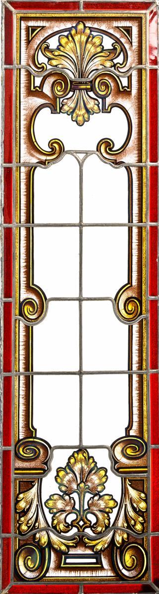 In Anlehnung an den Barockstil gestaltete Ornamentrahmung mit Blattwerk und Voluten, teils mit Opalglas-Imitat. 1 rote Randscheibe gesprungen, wenige Alters-/Gebrauchsspuren an den Bleiruten.