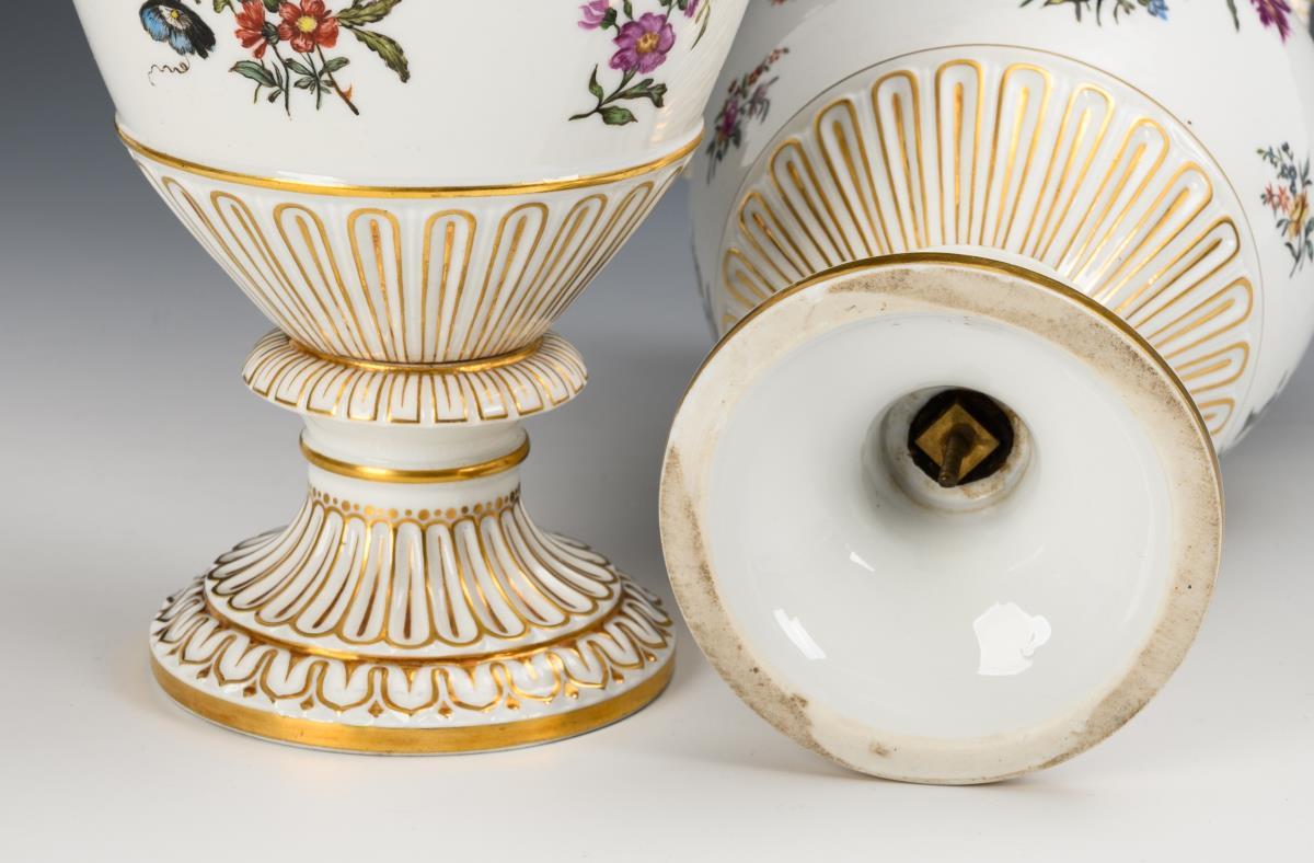 2 Schlangenhenkelvasen mit Blumenmalerei.