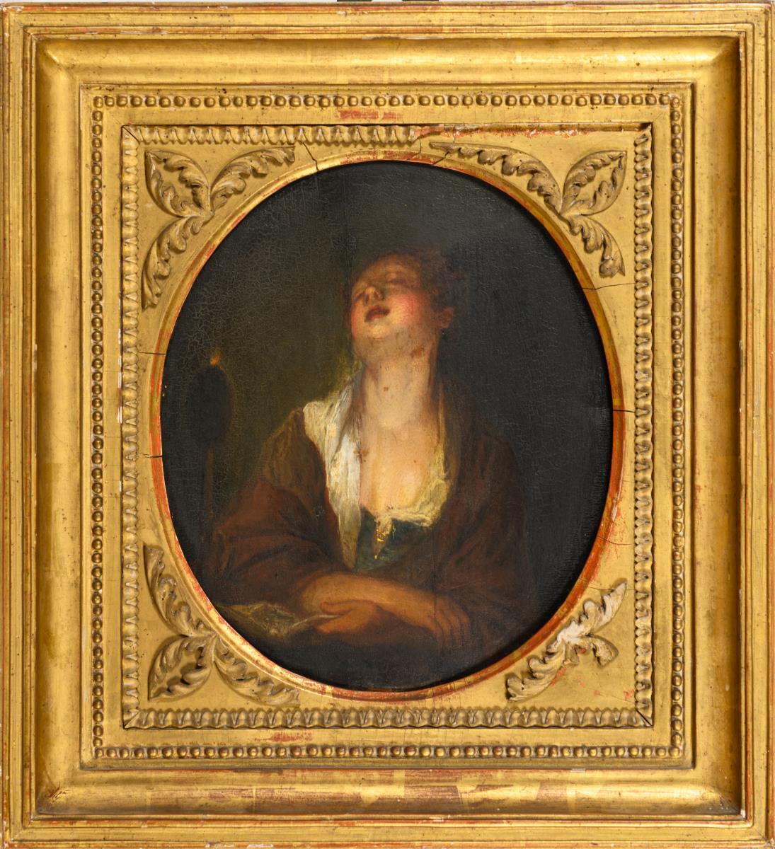 26 x 21,5 cm. Gerahmt : 38,5 x 35 cm (Goldstuckrahmen mit ovalem Bildausschnitt).