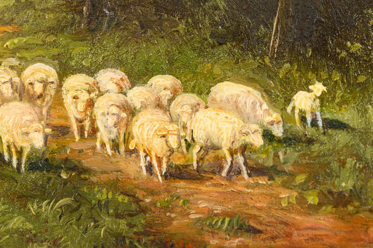 Die kleine Herde auf einem Weg zwischen Wiesen und Wäldern.