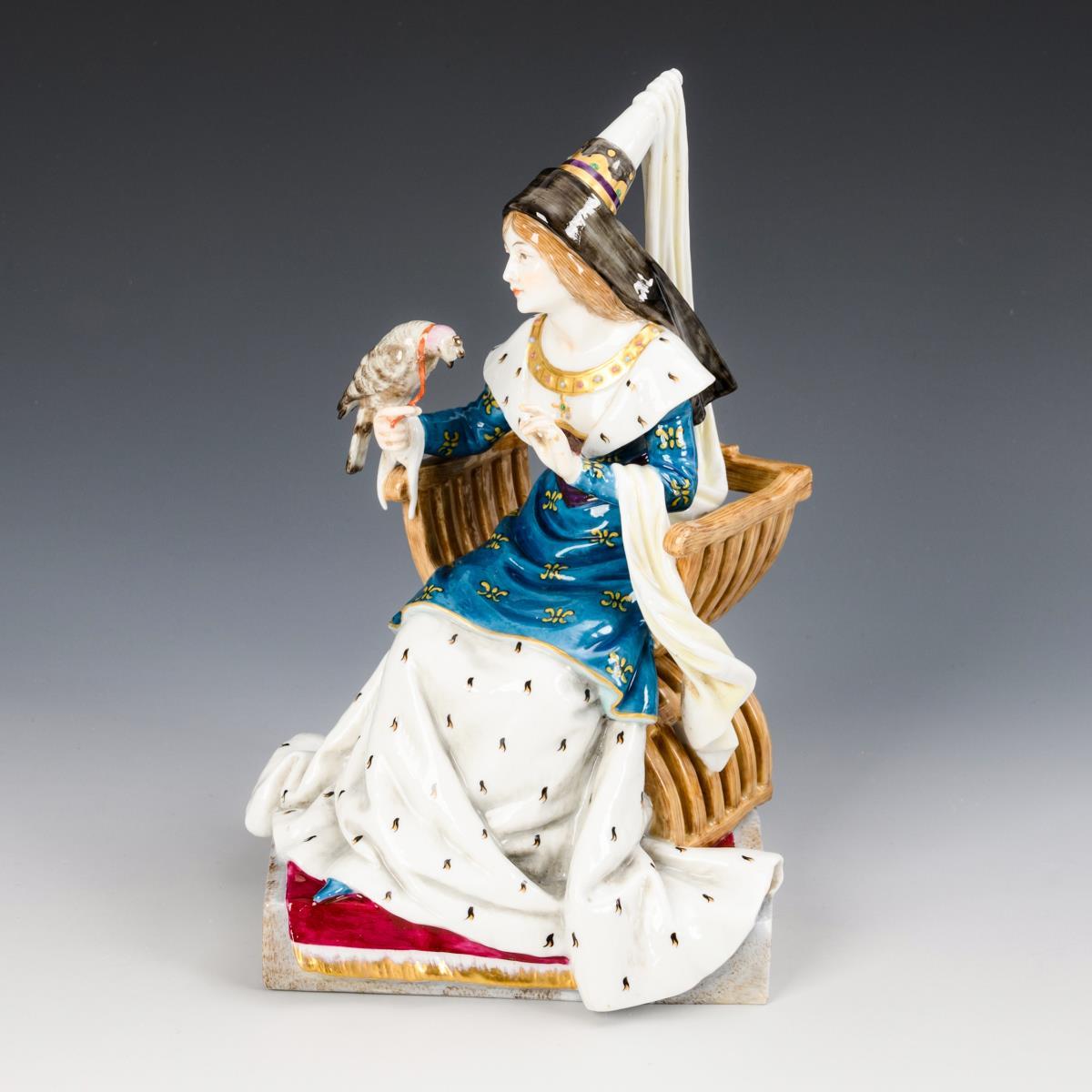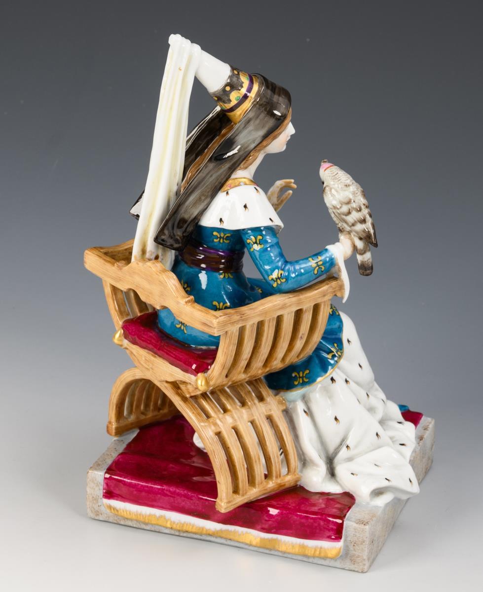 Historisierende Darstellung einer im Scherenstuhl sitzenden jungen Dame mit Hennin, einen Falken auf ihrer rechten Hand tragend. Band des Falken, 1 Finger und Spitze des Hennin bestoßen.