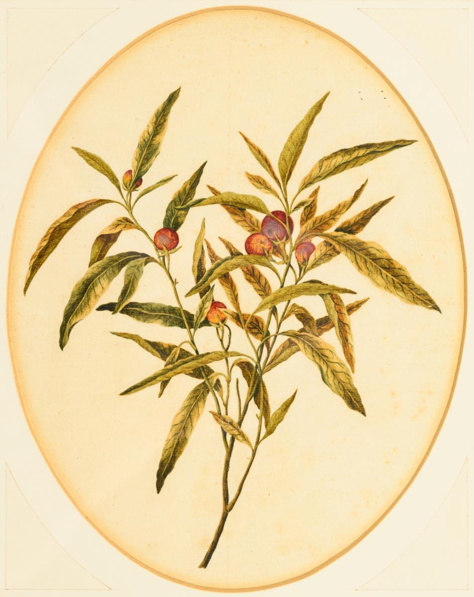 Isoliert dargestellter Lorbeerzweig mit reifenden Früchten.