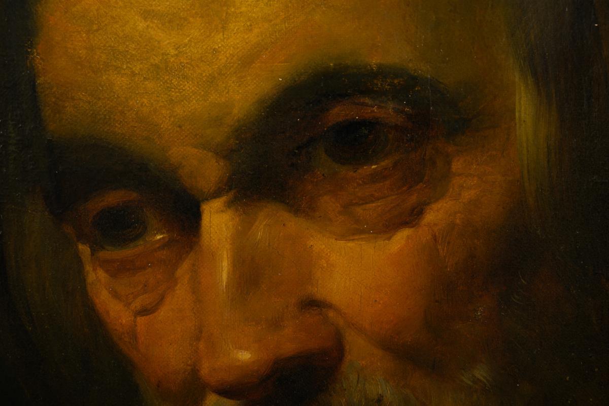 Nachdenklich blickender Geistlicher auf Buch und Schädel gestützt. Leinwand doubliert.