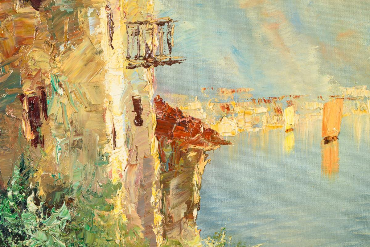 Blick vom Hang über die Dächer hinaus auf den See mit den vielen Seglern nahe der Küste. Leichte Altersspuren.