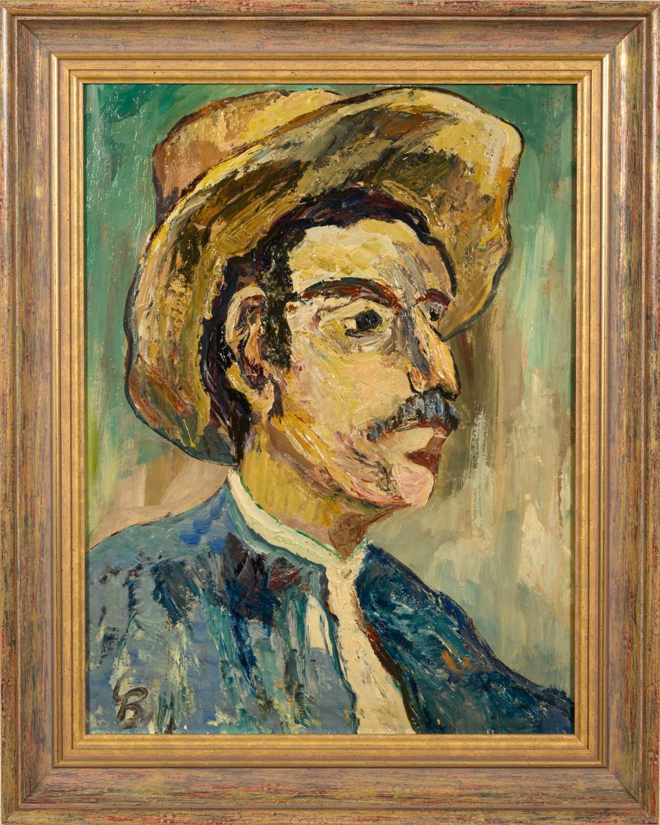 Porträt eines Mannes in blauer Jacke mit Hut.