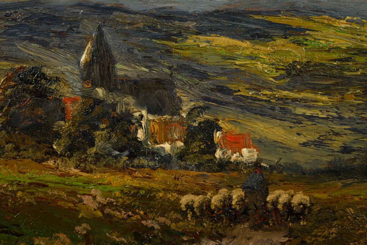 Hirte mit Schafen zwischen Hügeln mit blühenden Sträuchern oberhalb eines Dorfes. Farbabsplitterungen.