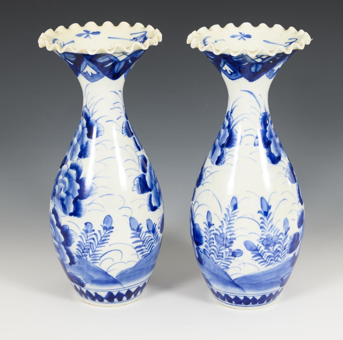 Schlanke Vasen mit großen Päonienblüten in Unterglasur-Blaumalerei. Innenansicht der offenen Mündung mit Bambusdekor. Holzsockel wohl jünger ergänzt. Boden dick glasiert. Eine Vase mit Randbeschädigung.