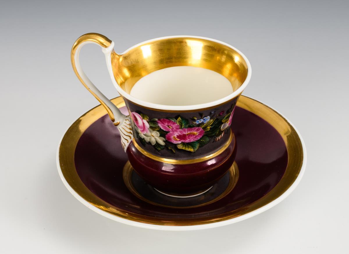 Polychrom bemalt, goldstaffiert. Tasse (H 10 cm), Untertasse (Ø 15 cm).