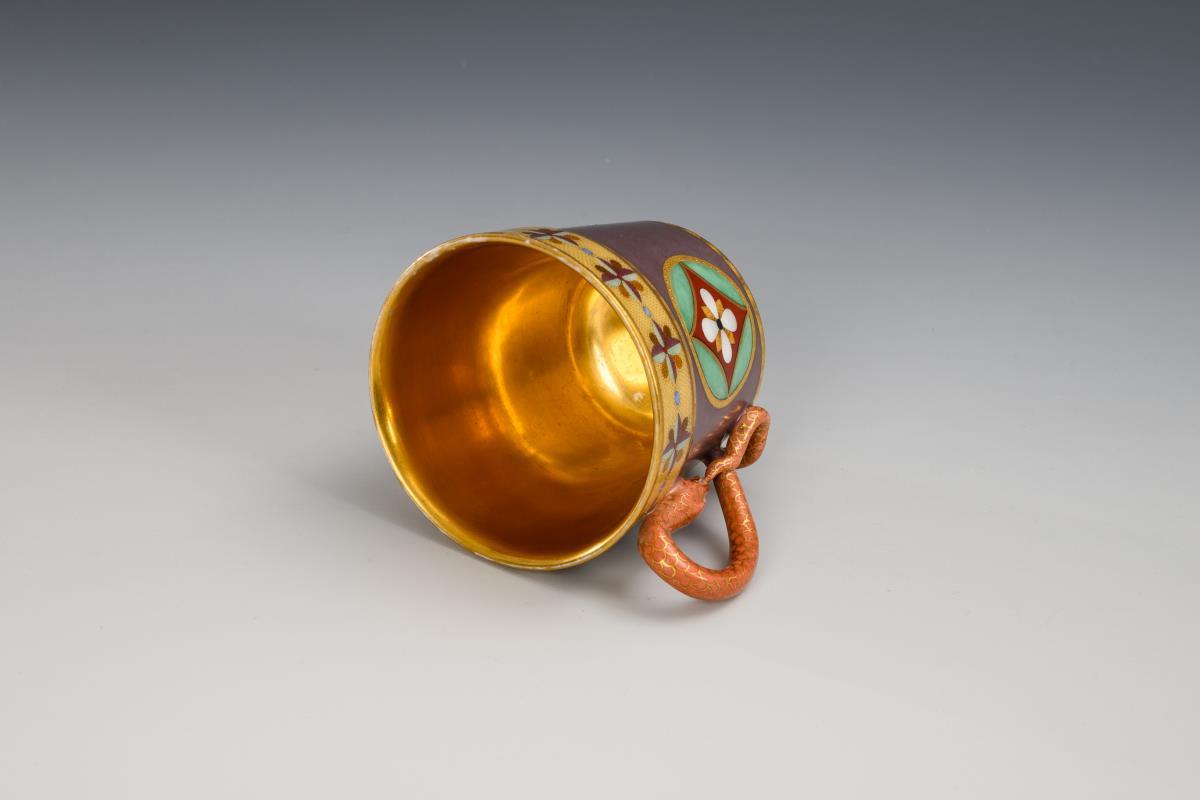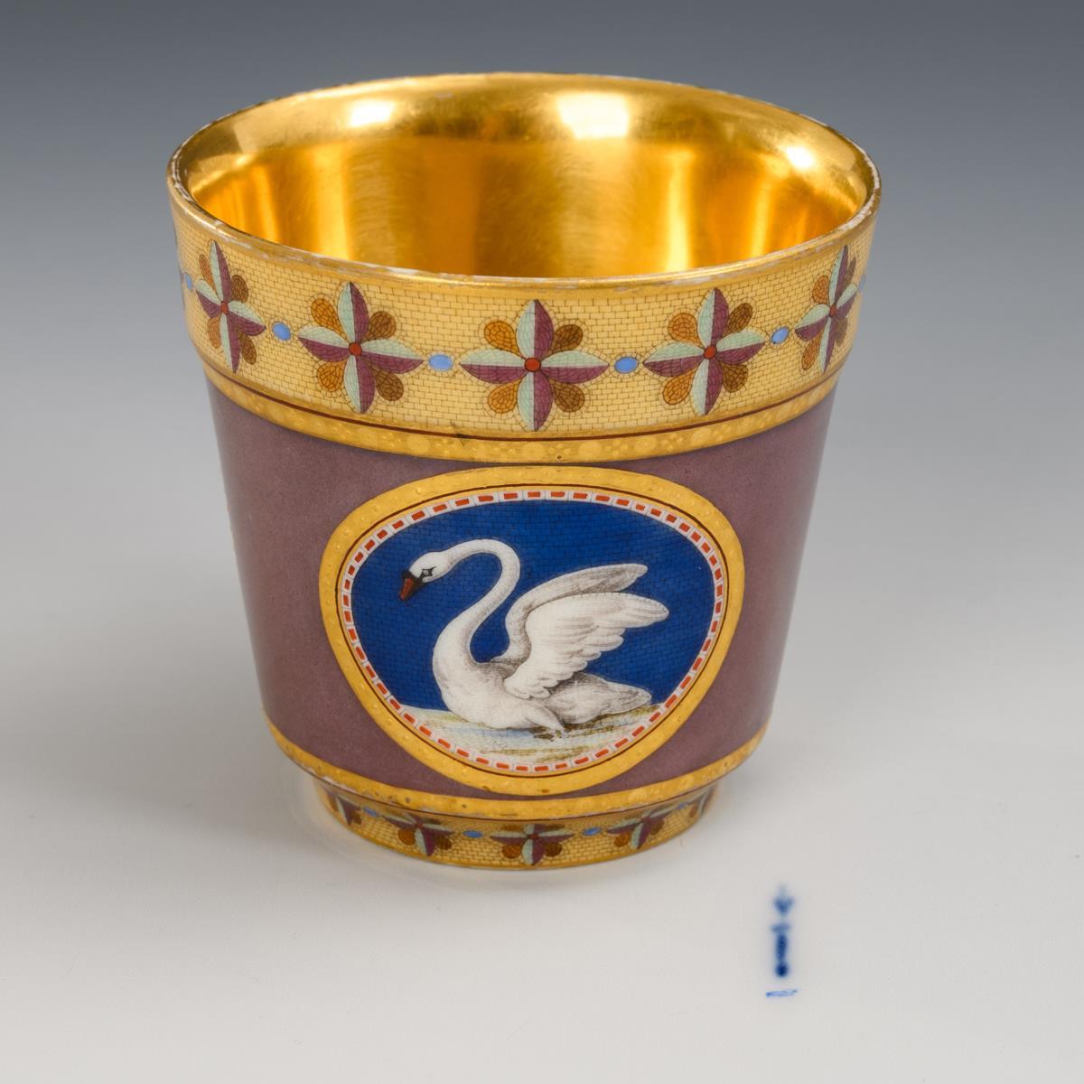 Konische Tasse mit Schlangenhenkel. Violetter Lüsterfond, in Mikromosaiktechnik die schauseitige Darstellung eines Schwanes sowie eine stilisiert florale Bordüre an Rand und Stand, verso zwei Medaillons mit Pietro-Dura-Imitationen in Eisenrot, Ocker, Weiß und Mintgrün, goldener Innenfond. Riss im Henkel, minimaler Goldabrieb.