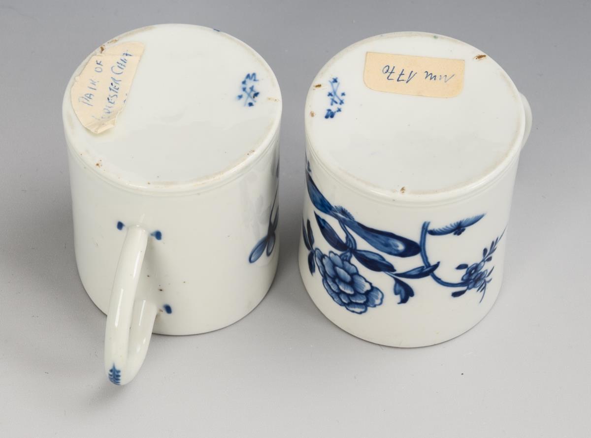 Zylindertassen mit Ohrenhenkel und unterglasurblauer Blumenmalerei im asiatischen Stil.