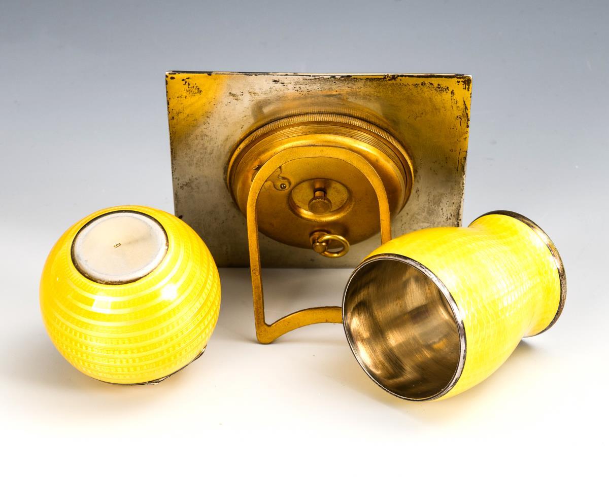 Silber guillochiert, transluzides Email. Uhrplatte 9 x 9 cm, H Becher 6 cm. Gewicht bei herausgeschraubter Uhr 208 g.