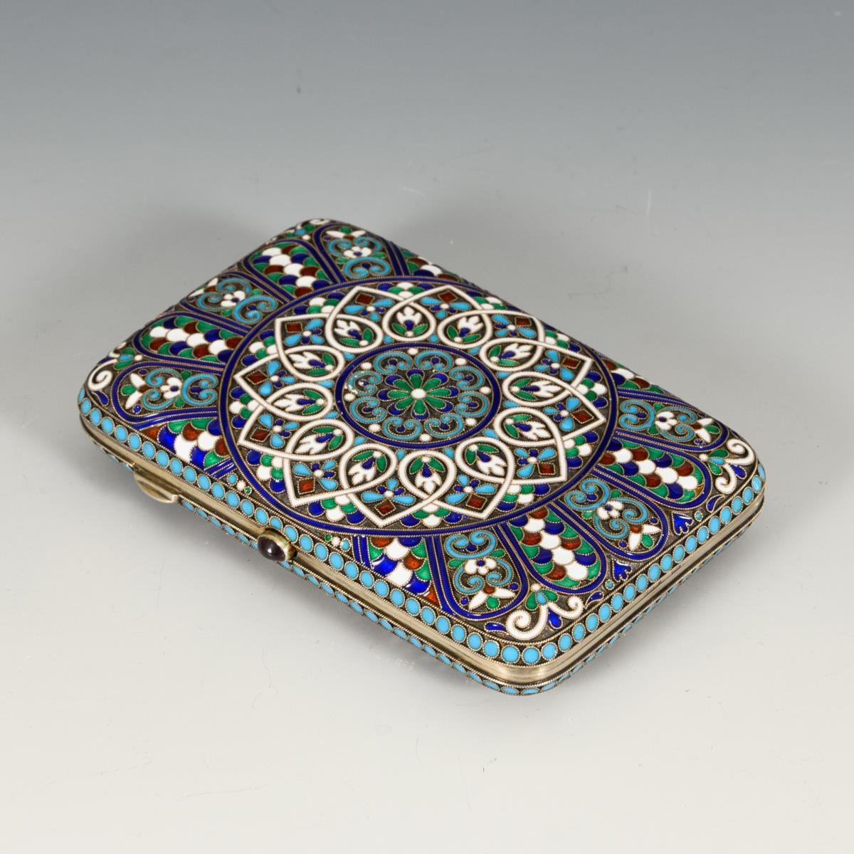 In Cloisonné-Technik verziertes Silberetui mit Rubin-Cabochon am Verschluss.