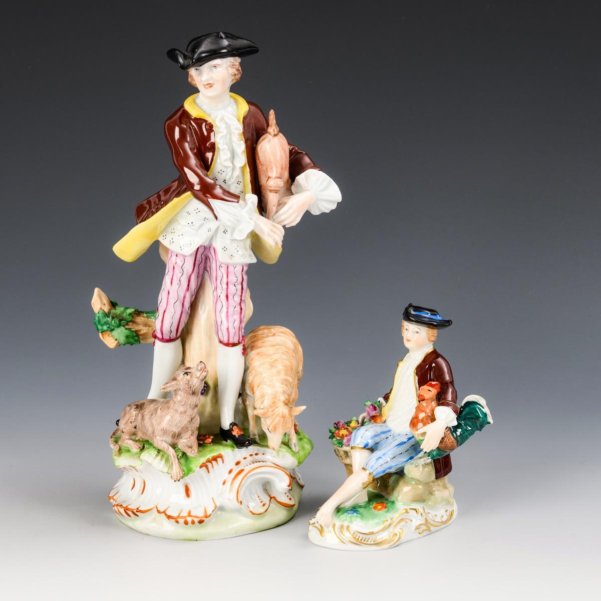 Schäfer mit Dudelsack, Schaf und Hund (H 24 cm). / Gärtnerknabe mit Blütenkorb und Hahn (H 10,5 cm). Dudelsackpfeife und 1 Blatt bestoßen.