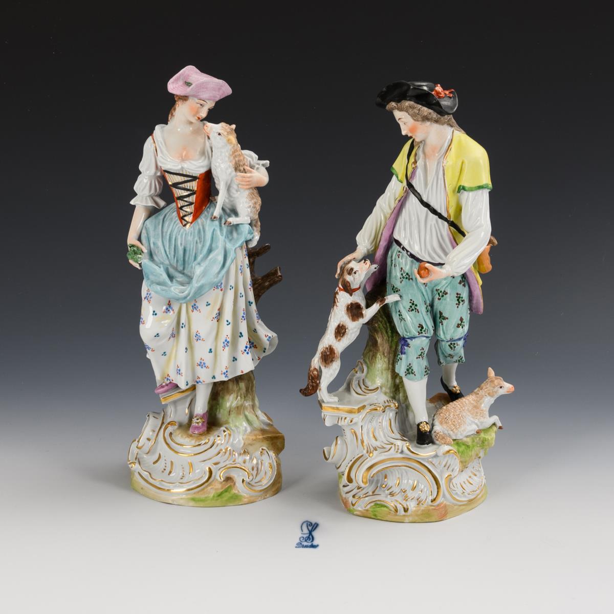 Schäferin mit Schaf und Schäfer mit Hund und Schaf. 1 Schafohr restauriert, Bestoßung am Grasbüschel der Schäferin.