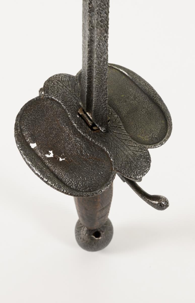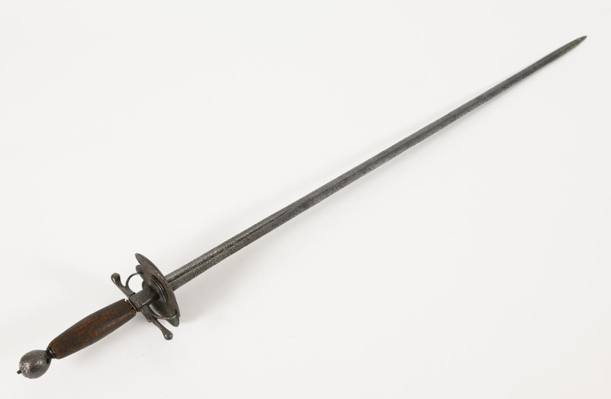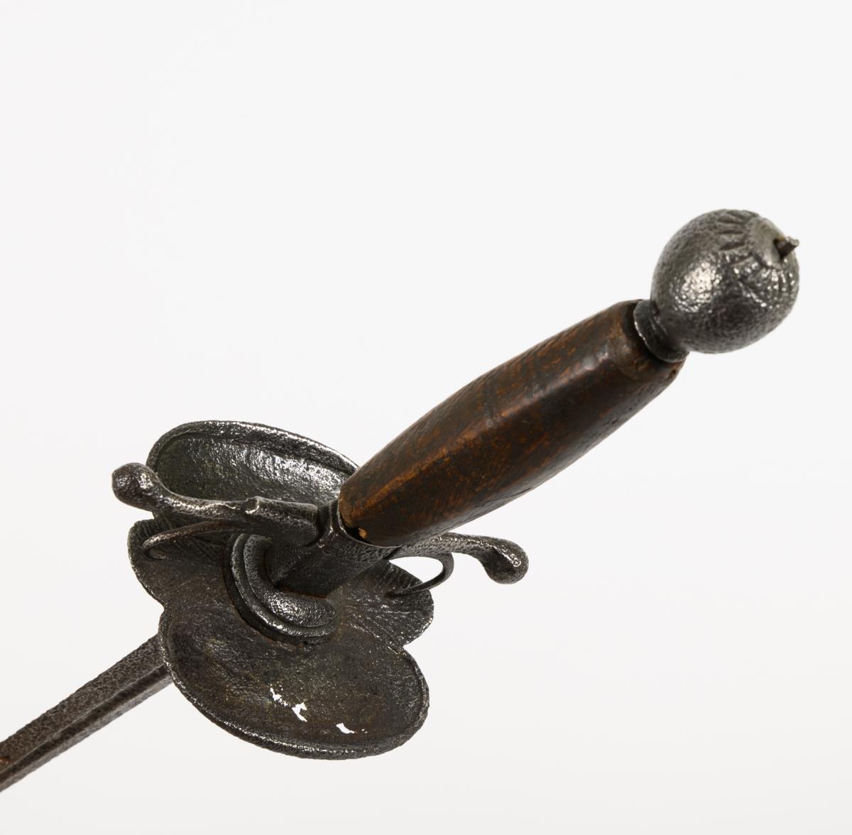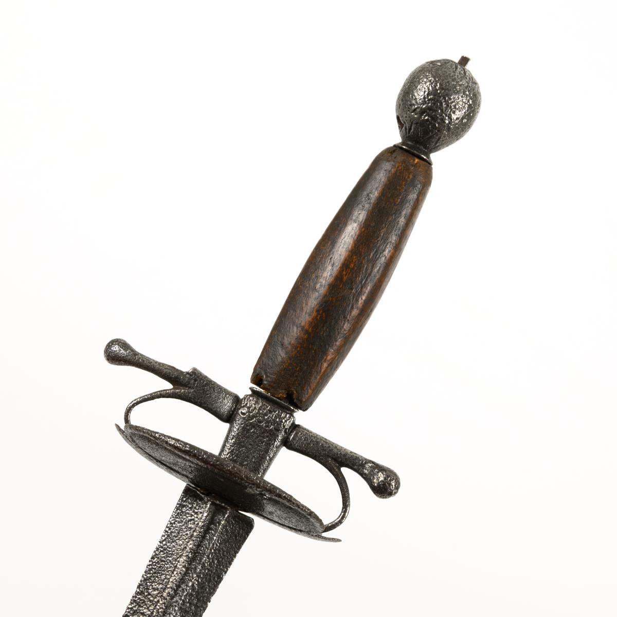 Gerade, zweischneidige Klinge mit Spitze in der Mittellinie und einem kurzen Hohlschliff in der Mittellinie. Nierenförmiges Stichblatt mit verziertem Mittelstück, zwei Fingerringe und gerade Parierstange mit tropfenförmigen Enden. Kugelknauf mit Resten von Verzierung. Holzgriff. Bügel fehlt, ein Parierstangenende etwas verbogen, ein Stichblatt mit Durchrostungen, alle Teile mit stärkeren Korrosionsnarben, Angel nicht vernietet. Metall gut konserviert.