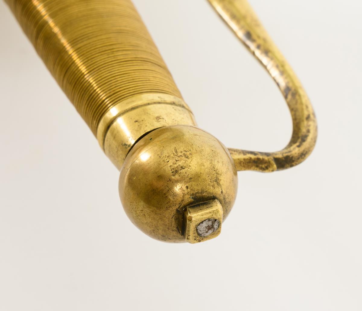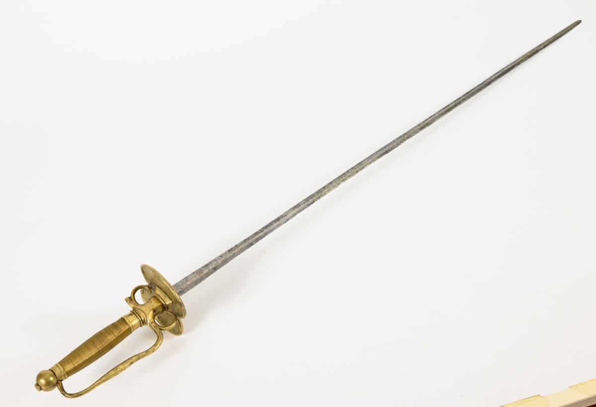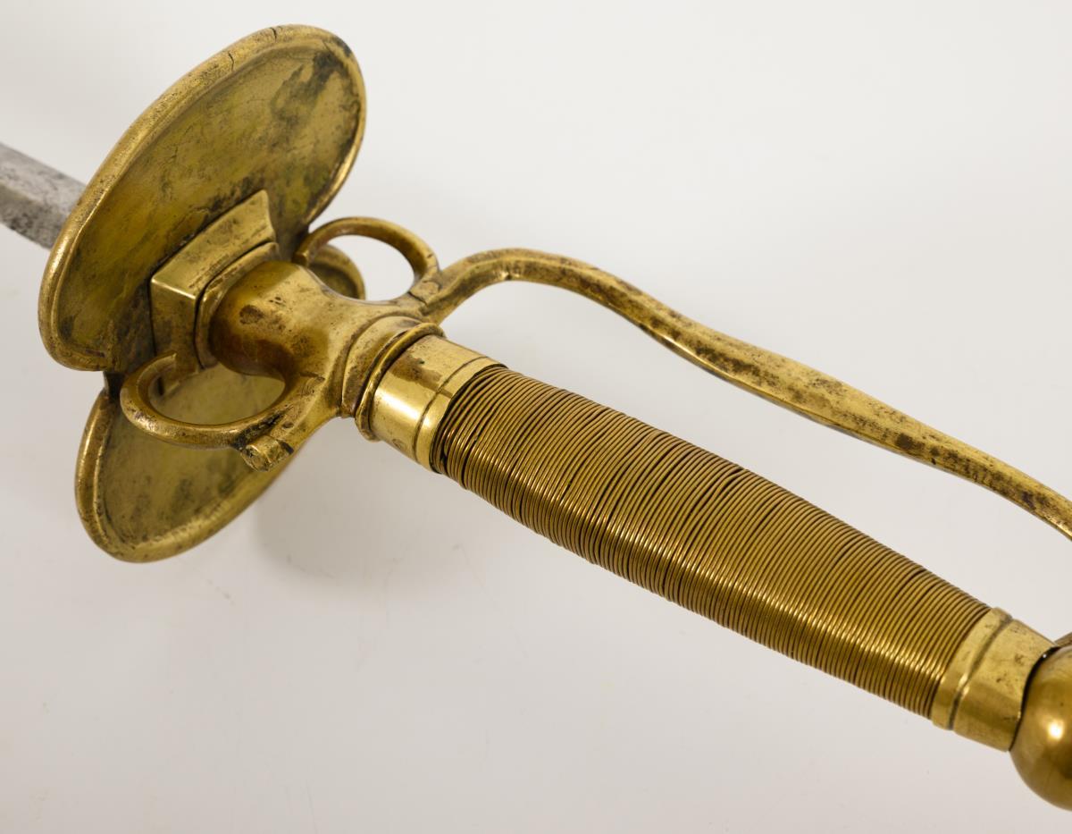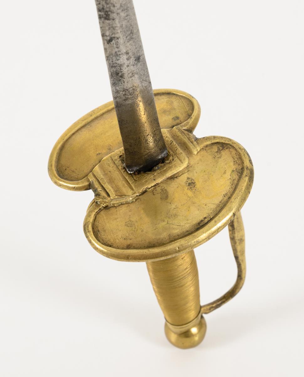 Gerade, zweischneidige Klinge mit linsenförmigem Querschnitt. Messinggefäß mit zwei nierenförmigen Stichblättern, zwei Fingergriffen und mehrpassigem Bügel. Parierstangenende fehlt wohl. Kugelknauf mit Vierkant. Handgriff mit glatter Messingdrahtwicklung. Veränderungen am Stichblatt beim Angelloch.