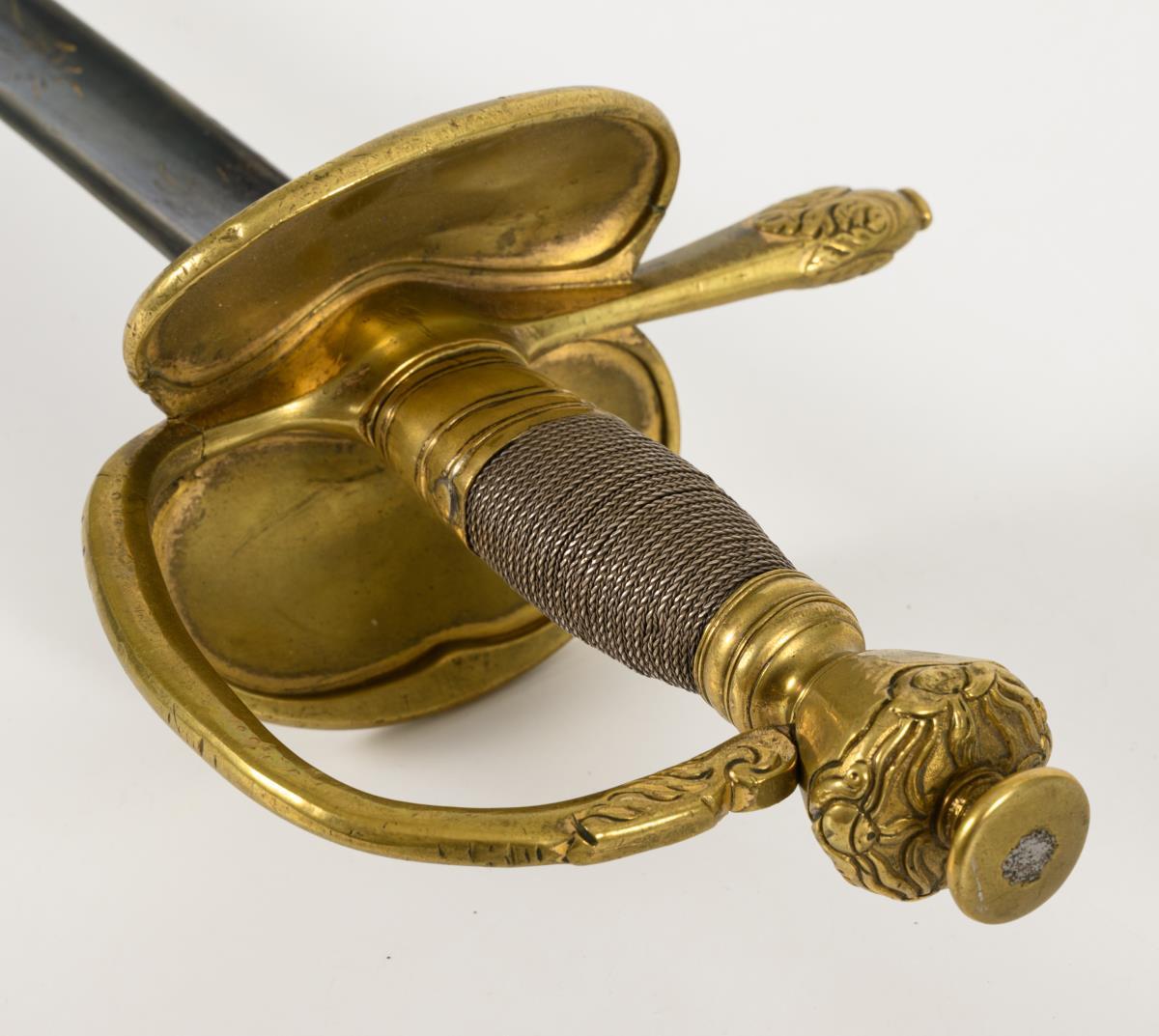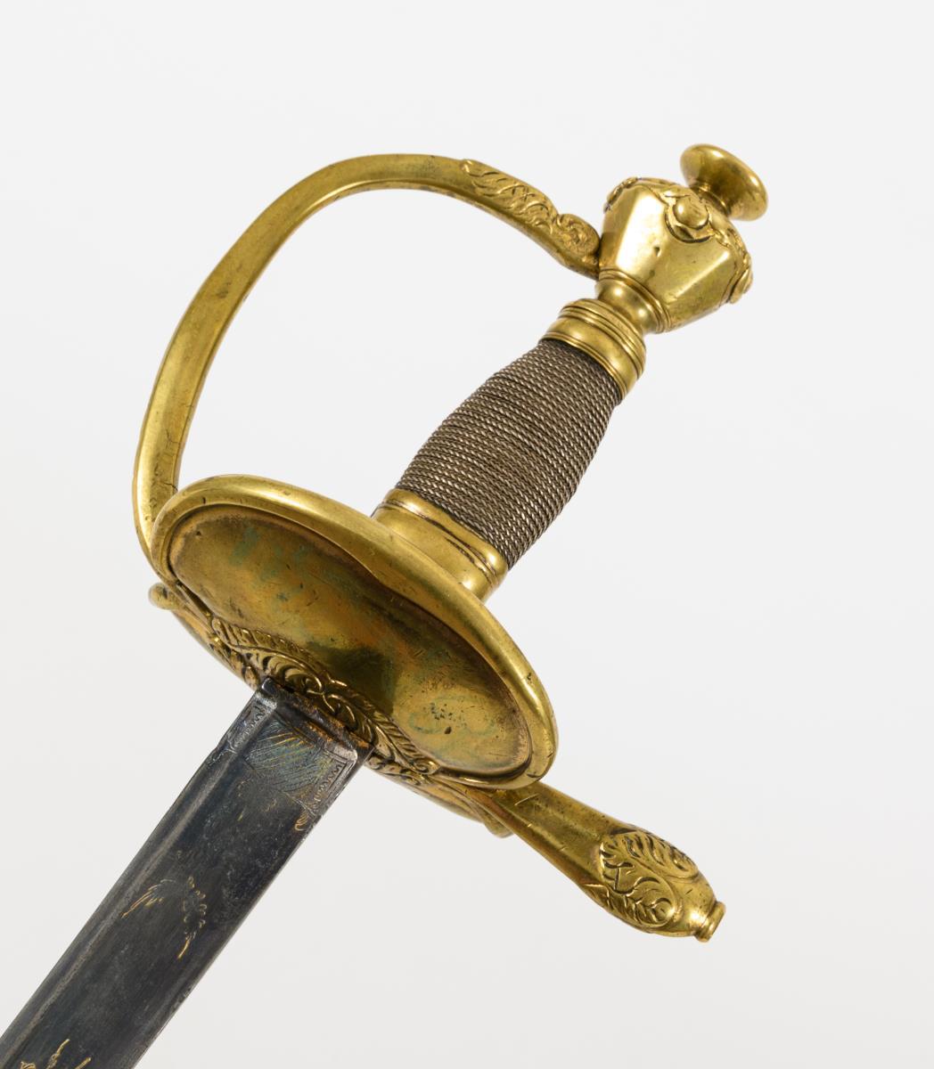 Gerade, einschneidige Klinge mit breitem Hohlschliff, unteres Viertel gebläut, mit etwas verputztem Dekor. Messinggefäß mit nierenförmigem Stichblatt, diese leicht reliefiert und wenig eingerissen. Bügel und Ende der einseitigen Parierstange mit Akanthusblattrelief. Griff mit kurzer Drahtwicklung. Mehrpassiger, konischer Knauf mit Relief und großem Knopf. Schwarze Lederscheide mit langem Haken (zwei Knicke).