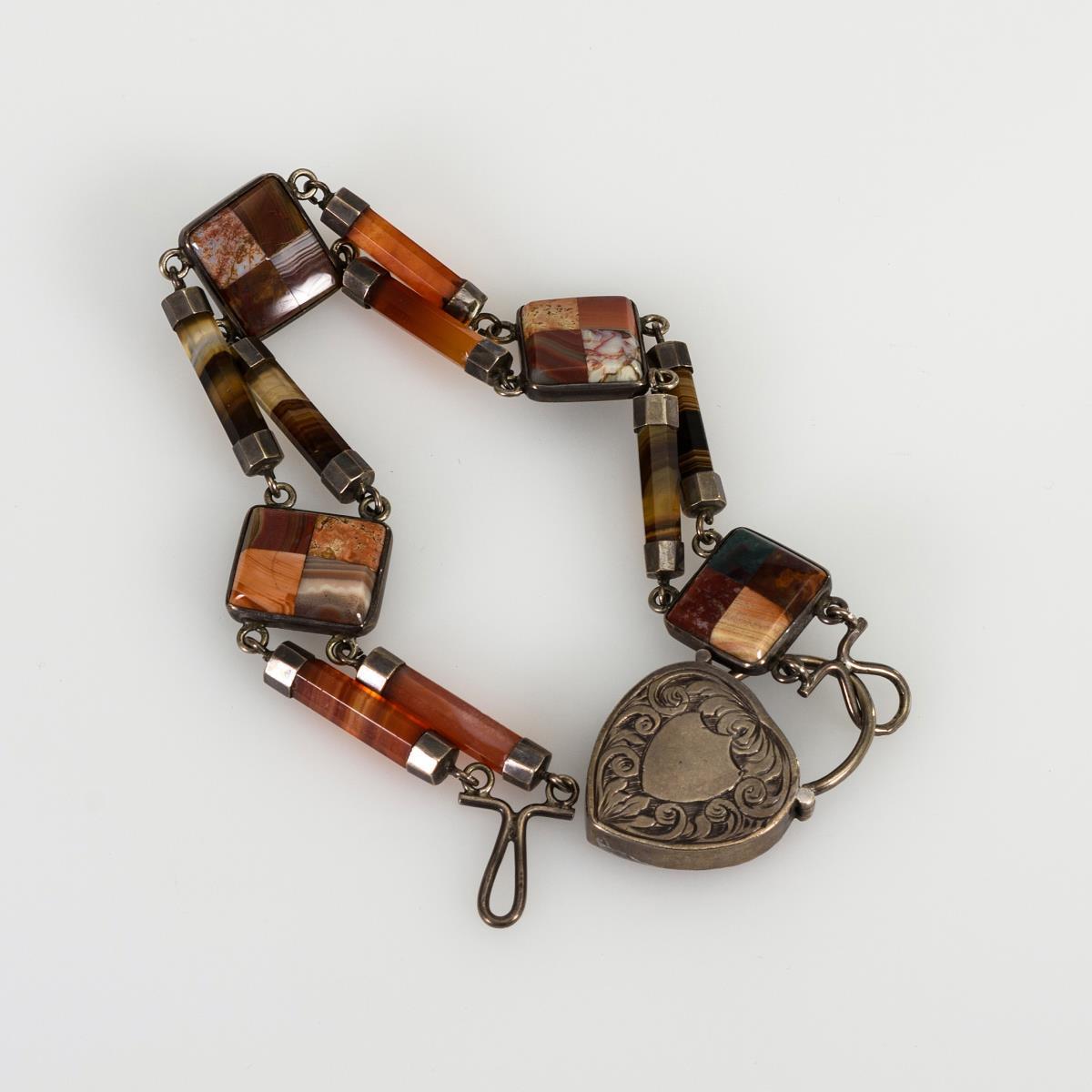 Facettierte Achatstäbe und gefasste Hartsteine an Herzschloss mit ungravierter Wappenkartusche und Achateinlage.
