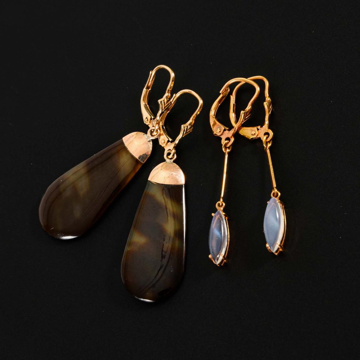 Flache Hornabhängungen und zargengefasste Mondsteincabochons, an Federbügeln.