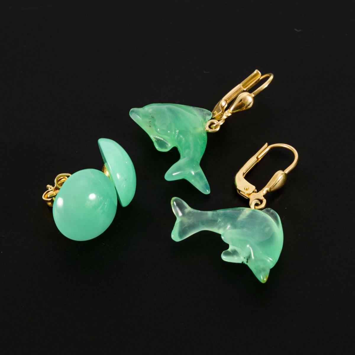 Abgehängter Delphin und Kugelcabochons, an Federbügel/Steckmechanik.