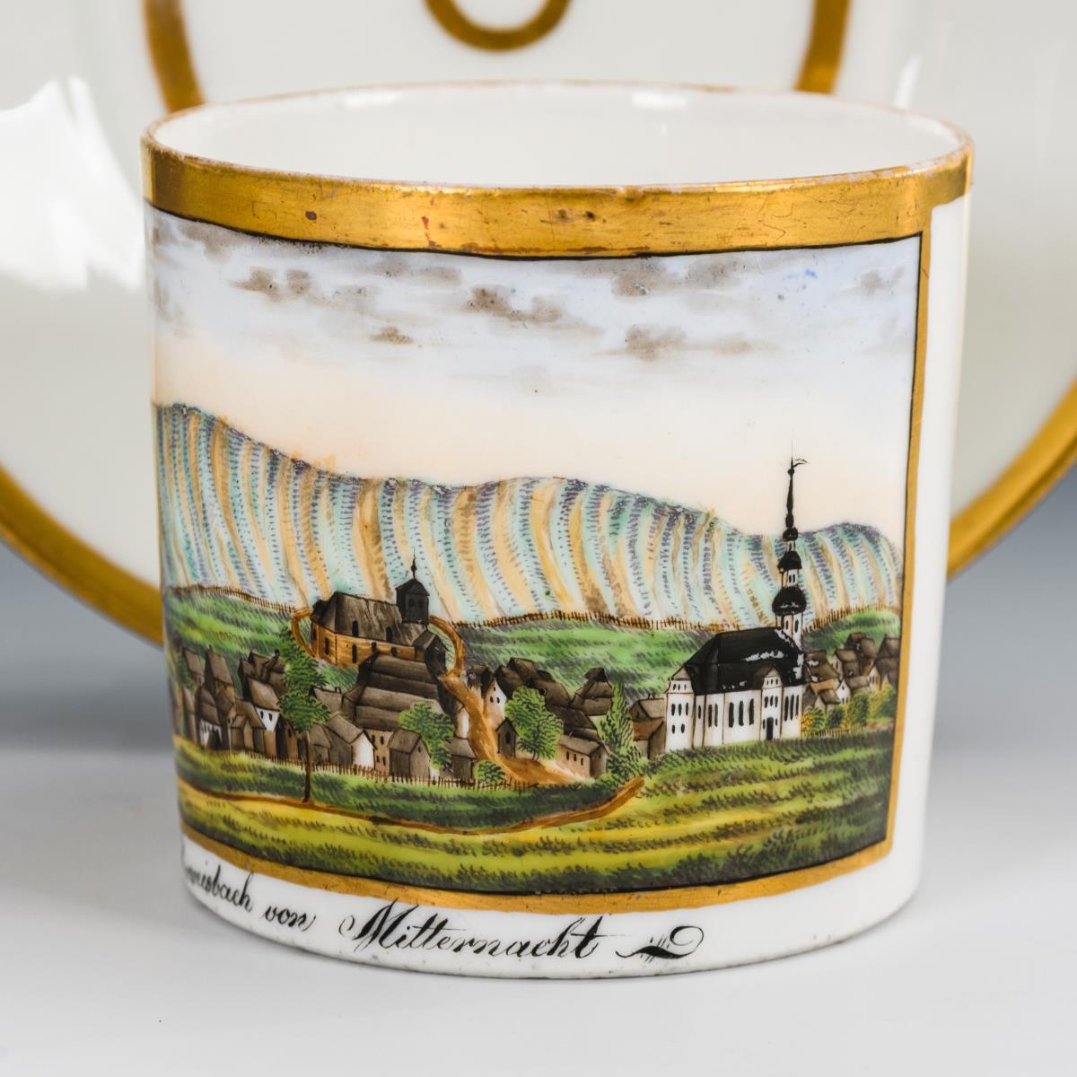 Polychrom bemalt, goldstaffiert. H Tasse 6 cm, Ø ergänzte Untertasse 13 cm.