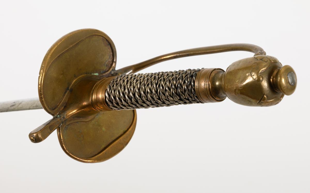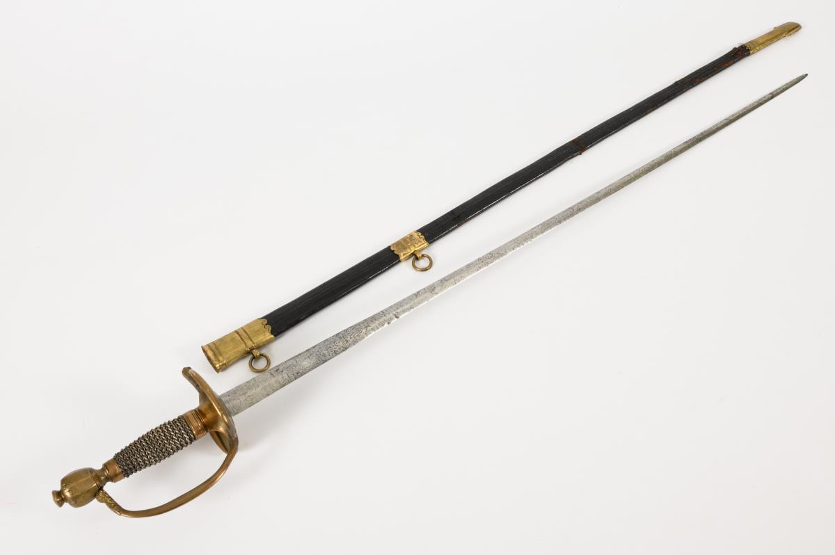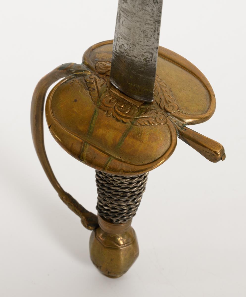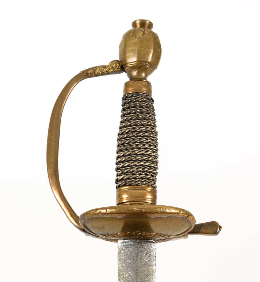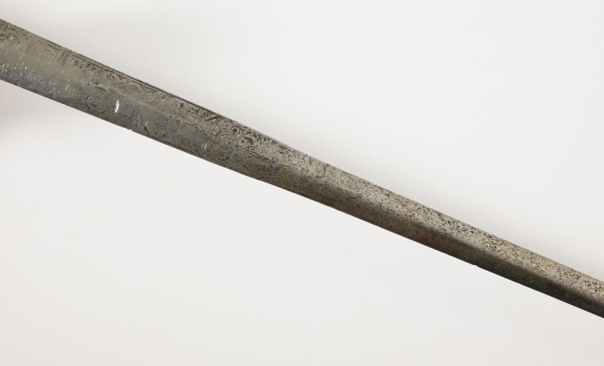 Gerade, konische, zweischneidige Klinge mit Spitze in der Mittellinie, linsenförmiger Querschnitt. Mustergravur im unteren Viertel stark verputzt. Bronzefarbenes Gefäß mit relativ kleinen, nierenförmigen Stichblättern, diese von unten gemustert. Mehrpassiger Knauf mit hoher Niete. Kräftige Drahtwicklung am Griff. Dazu schwarze Lederscheide mit verzierten Messinghülsen und zwei Trageringen. Alters- und Gebrauchsspuren. Parierstange angelötet.