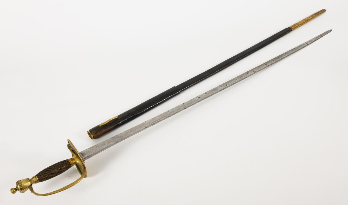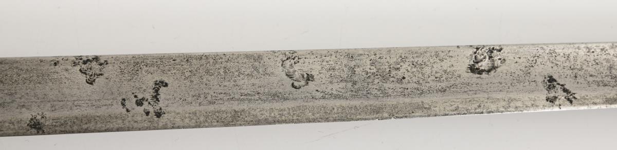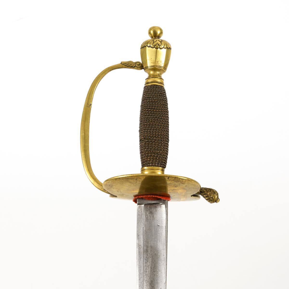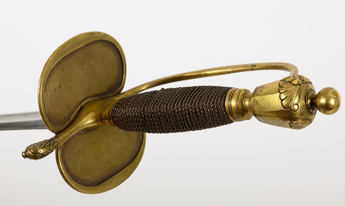 In der Art der IOD, alter Art. Gerade, leicht konische, einschneidige Klinge mit breitem Hohlschliff und einigen Korrosionsnarben. Messinggefäß mit breiten, nierenförmigen Stichblättern. Drahtwicklung, konischer, mehrpassiger Knauf mit Akanthusrelief. Schwarze Lederscheide mit verzierter Messingspitze und Lederverstärkung auf der Hälfte. Langer Haken.