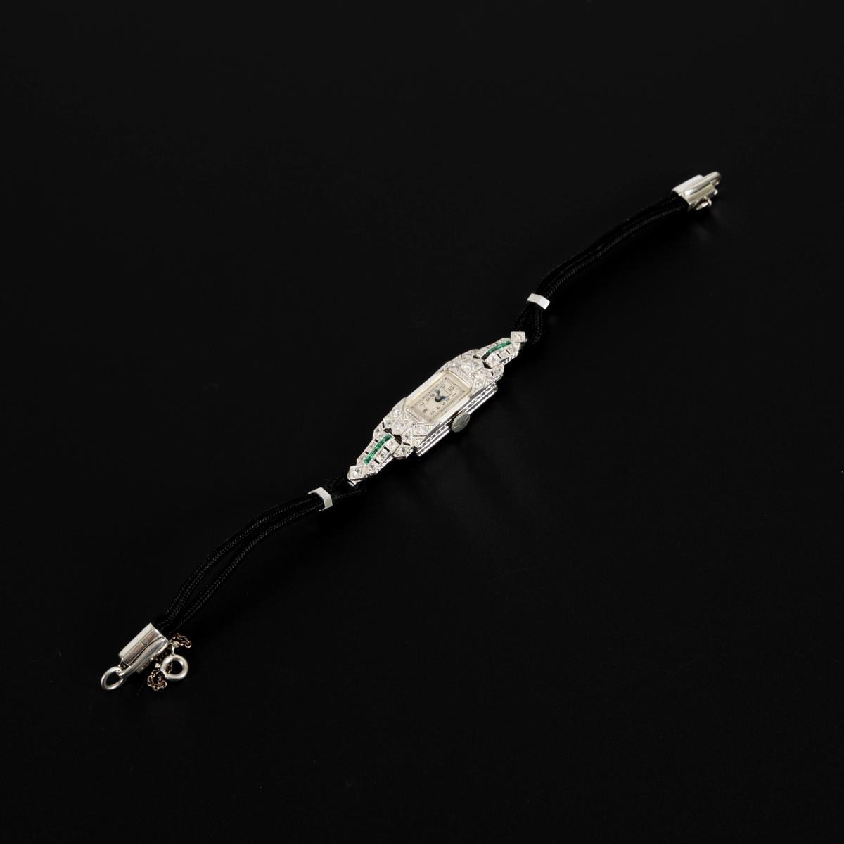 Art-déco-Damenarmbanduhr mit Altschliff-Diamanten und Smaragden.