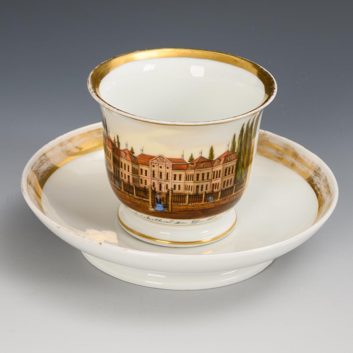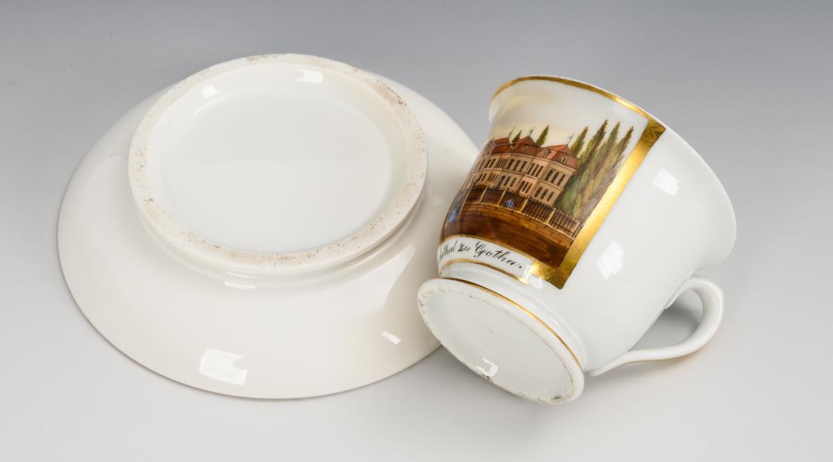 Gefußte Glockentasse mit Ohrenhenkel. Schauseitig eine goldgerahmte Rechteckkartusche mit der bezeichneten Ansicht des Schlosses Friedrichsthal in Gotha. Gold teils berieben.
