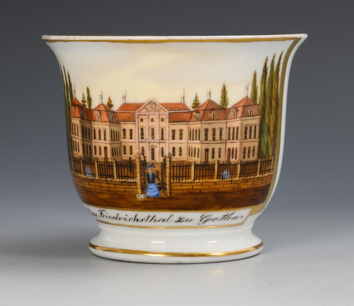 Gefußte Glockentasse mit Ohrenhenkel. Schauseitig eine goldgerahmte Rechteckkartusche mit der bezeichneten Ansicht des Schlosses Friedrichsthal in Gotha. Gold teils berieben.