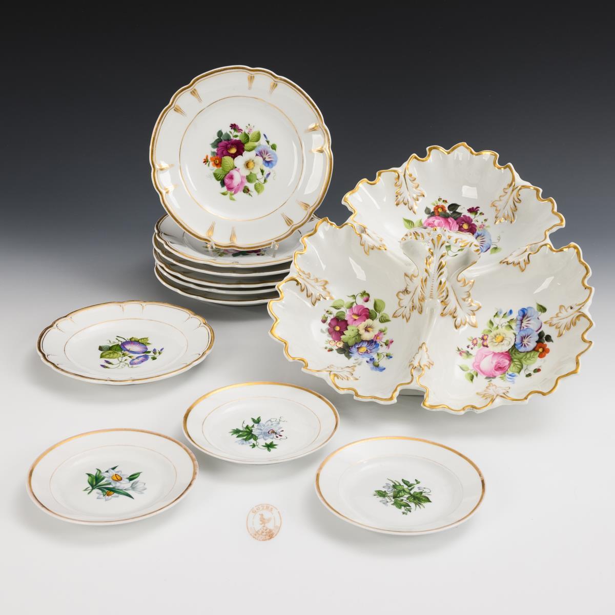 Cabaret und 6+3+1 Teller mit Blumenmalerei. Gotha.