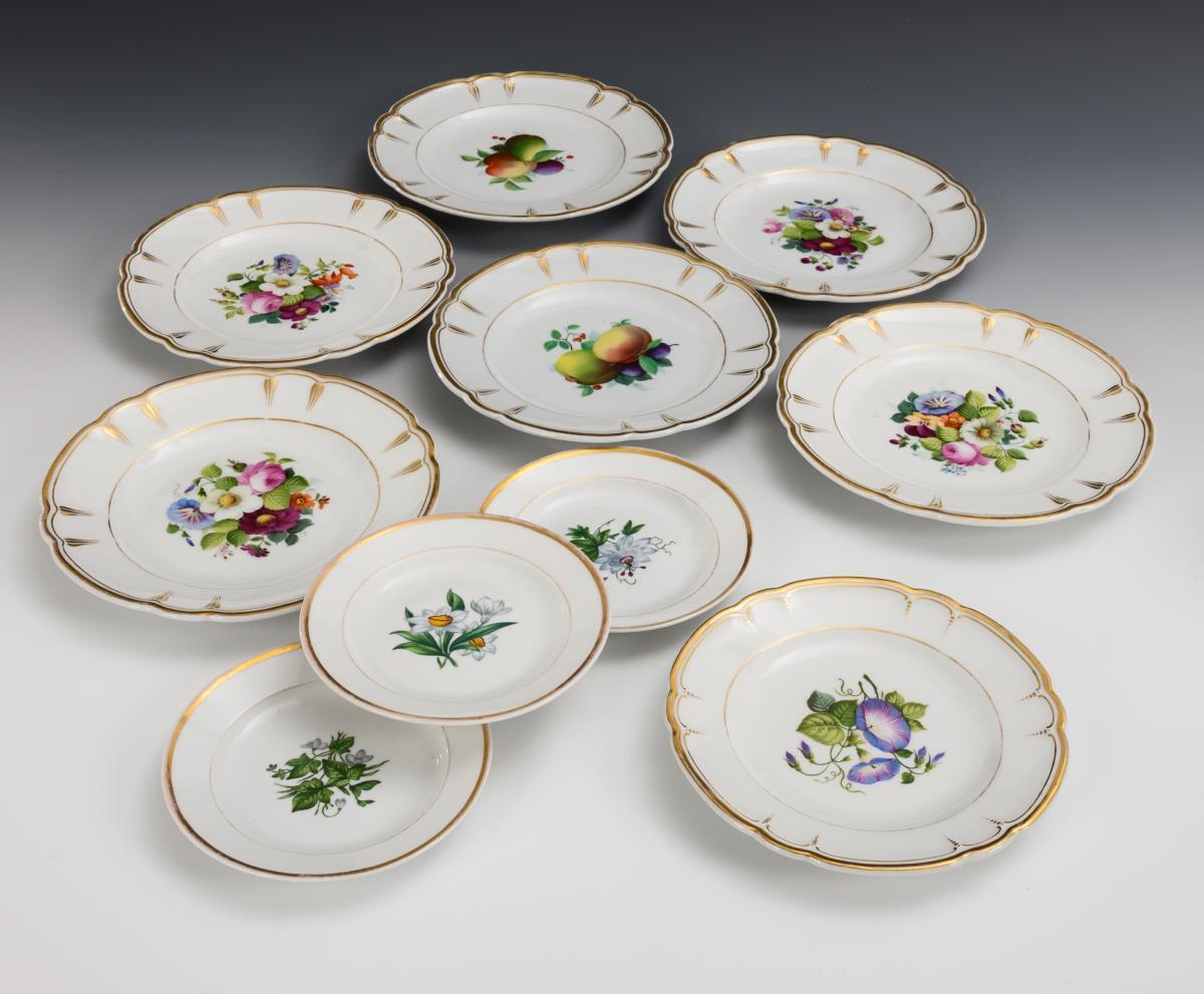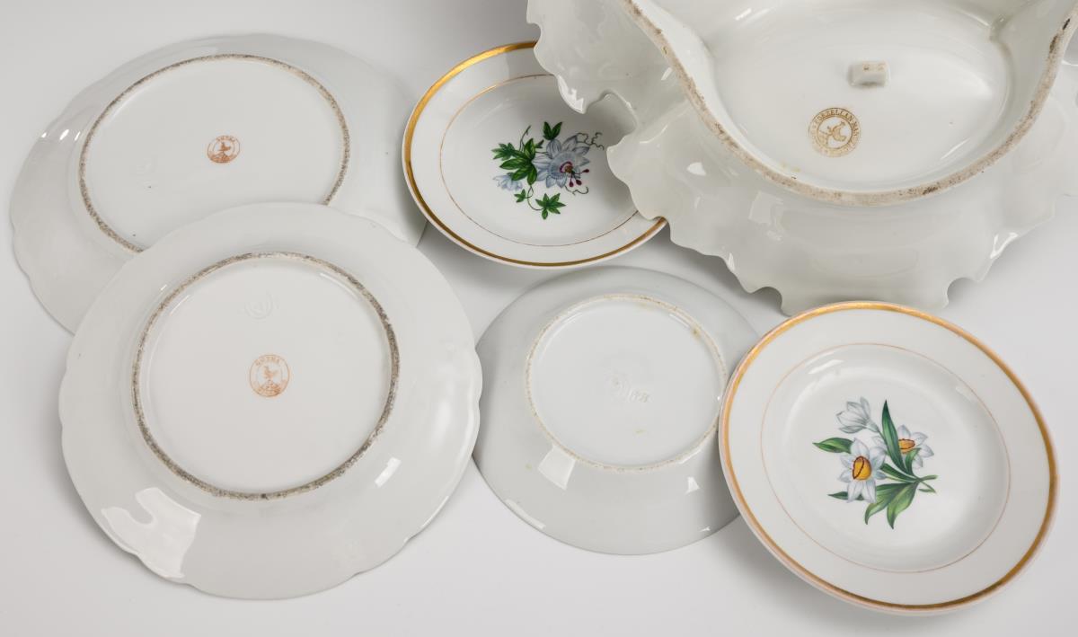 Cabaret aus drei Blattschalen mit mittigem Griff sowie verschiedene Teller (Ø 6x 20,5 cm, 1x 18 cm und 3x 14 cm). Kleine Bestoßung am Griff des Cabarets, minimaler Goldabrieb.