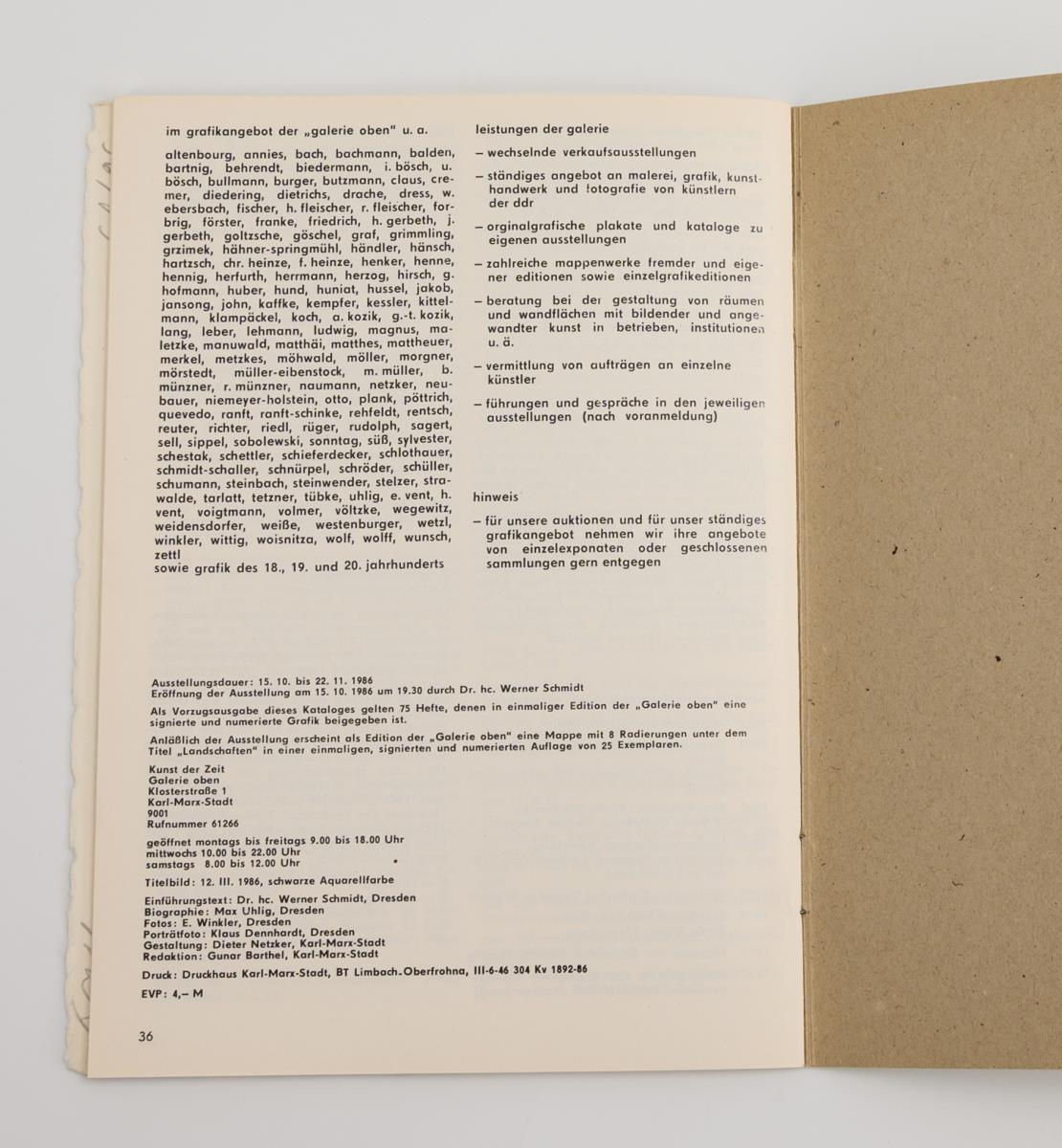 Seltene Vorzugsausgabe des Ausstellungsheftes anlässlich der Ausstellung in der Galerie Oben, Karl-Marx-Stadt (Chemnitz), Oktober - November 1986, mit beigelegter signierter und nummerierter Grafik (56/75).