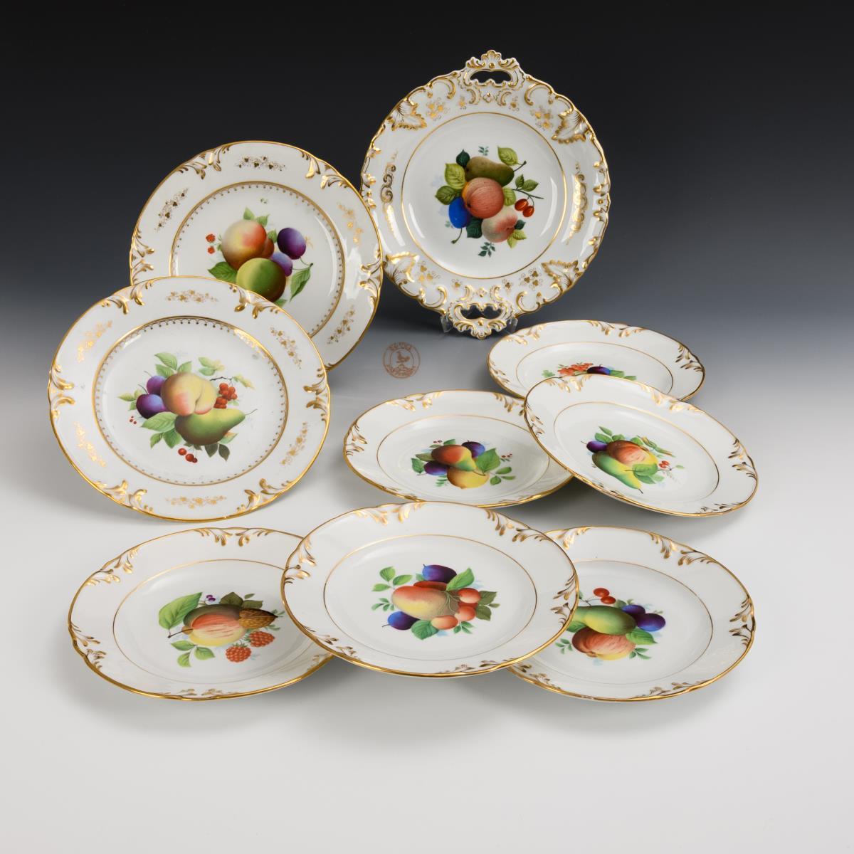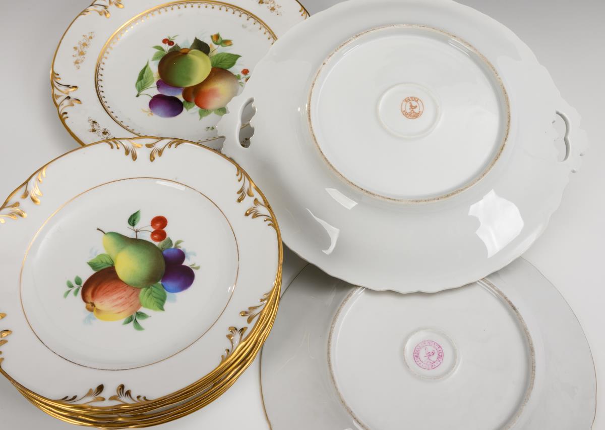 Kredenzteller und 2+6 Teller mit Fruchtmalerei. Gotha.