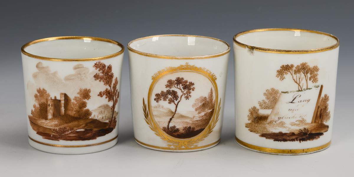 Leicht konische Tassen mit gewinkeltem Henkel. 2x mit Landschaftsmalerei und 1x mit der Darstellung eines Gedenksteines mit den Worten "Lang und glücklich". Partieller Goldabrieb, 1 Tasse mit Randchip und 2 Henkelhaarrissen, 1 Tasse mit Haarrissspinne und geklebtem Henkel.