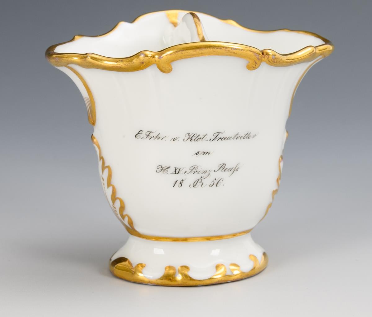 Passig-ovaler, gefußter Korpus mit goldstaffiertem Rocaillerelief und Mittelsteg. Schauseitig ein gemaltes Wappen mit Stier und doppelter Helmzier, verso die Widmung "E. Frhr. v. Klot-Trautvetter sm H. XV. Prinz Reuss 18 (...) 56". Minimaler Goldabrieb am Rand.