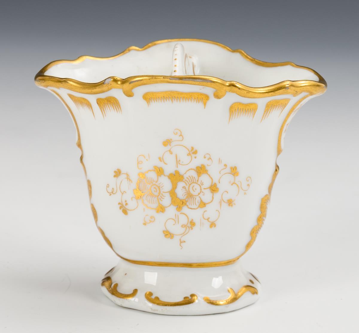 Passig-ovaler, gefußter Korpus mit goldstaffiertem Rocaillerelief und Mittelsteg. Schauseitig die bezeichnete Ansicht des Schlosses Reinhardsbrunn.