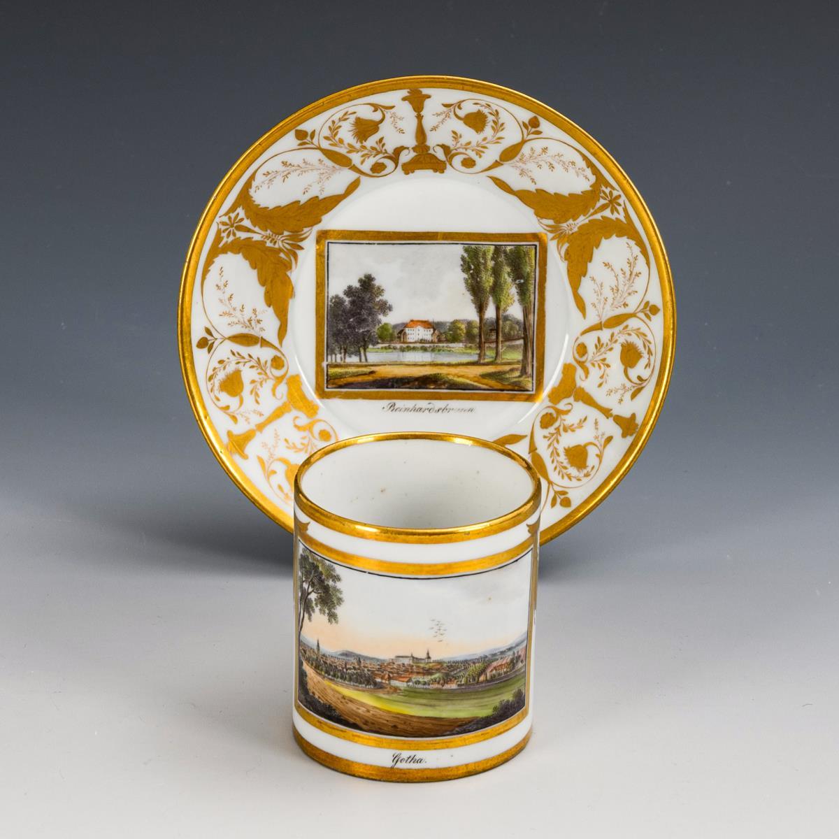 Zylindertasse mit Ohrenhenkel. Schauseitig eine goldgerahmte Rechteckkartusche mit der bezeichneten Ansicht der Stadt Gotha, im Spiegel die Ansicht des Schlosses Reinhardsbrunn, verso gravierte florale Goldmalerei. Unterseitig datiert "d. 27. Juli 1820.".