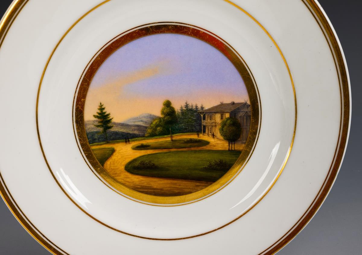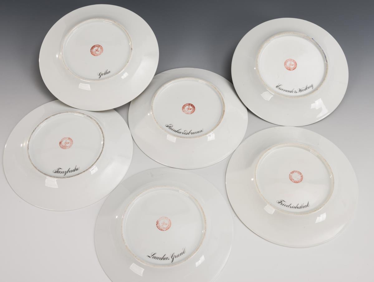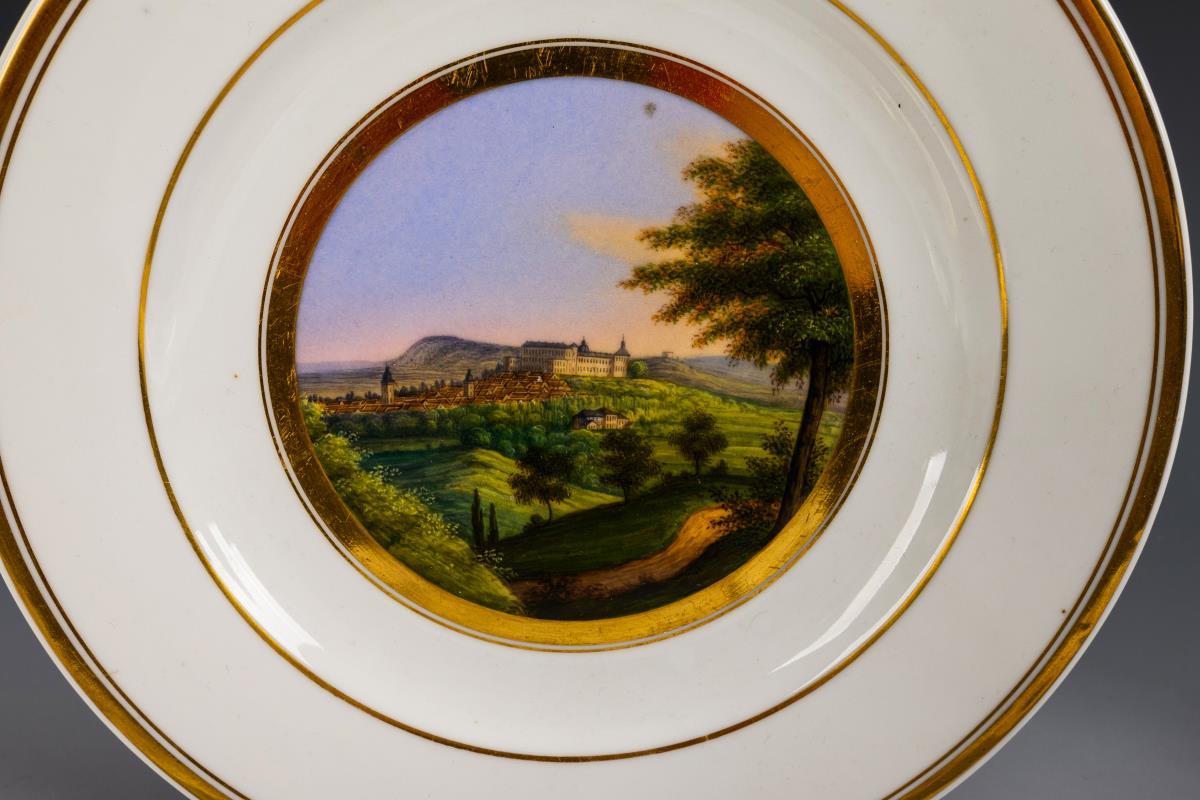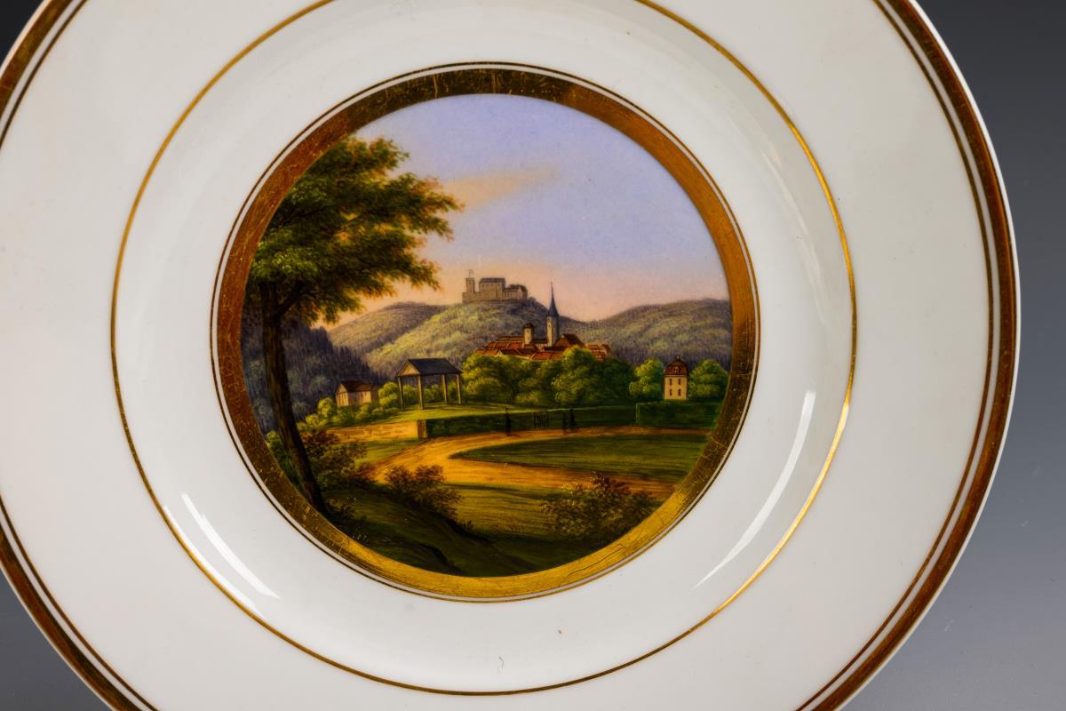 Glatte Teller, im Spiegel die unterseitig bezeichneten Ansichten von Eisenach mit der Wartburg, Gotha, Reinhardsbrunn, Friedrichsthal, der Tanzbuche und dem Laucha-Grund.