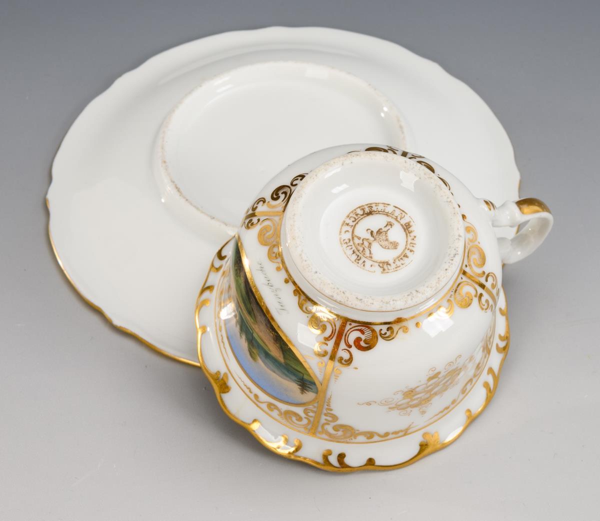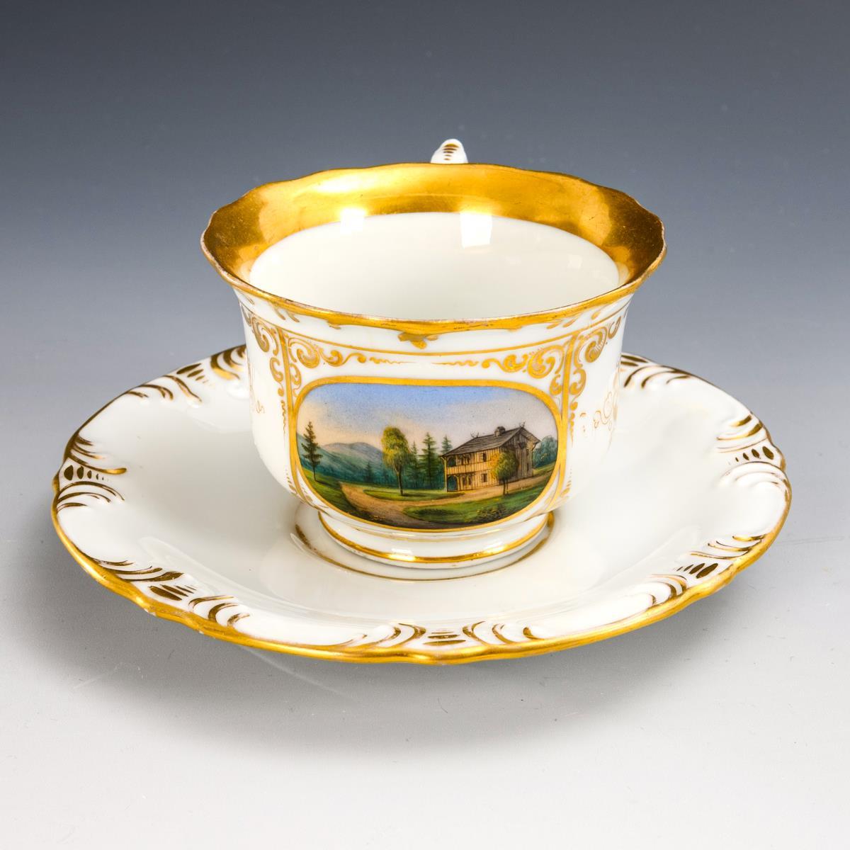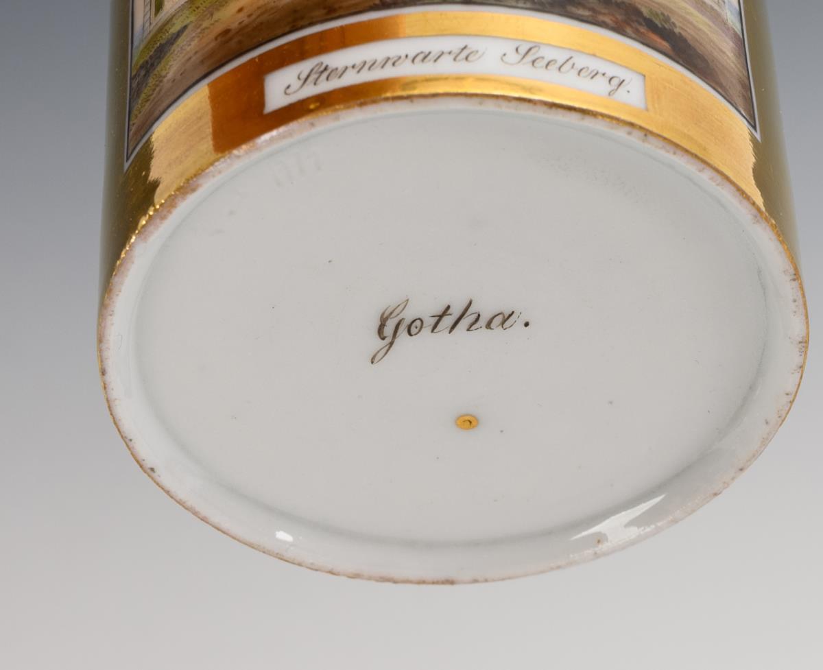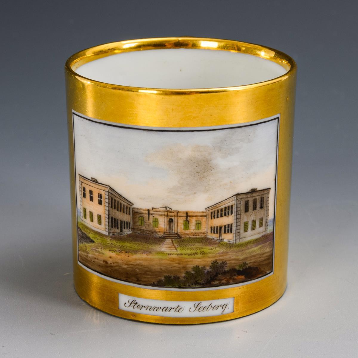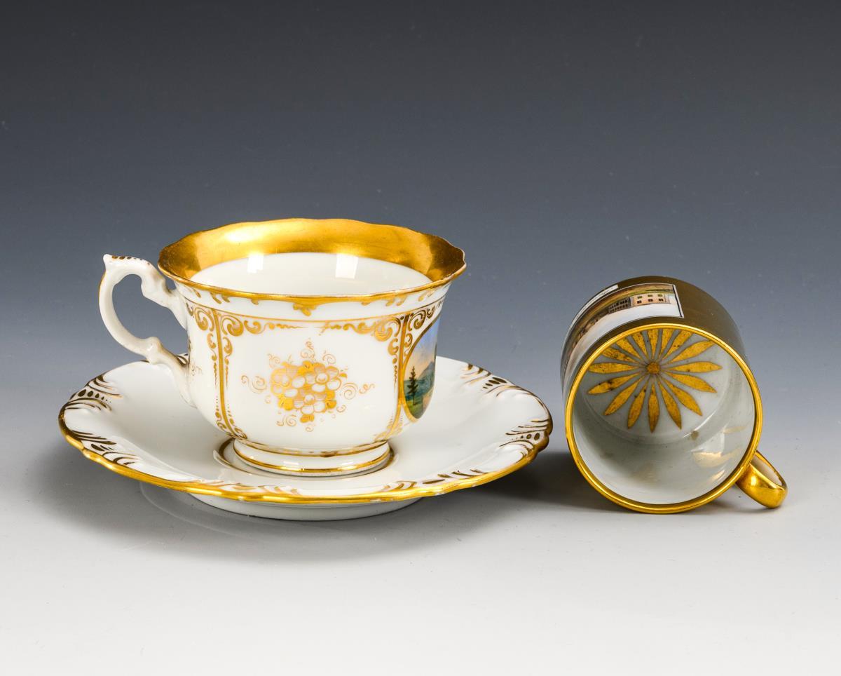 1x Zylindertasse mit Goldfond, schauseitig die bezeichnete Ansicht der Sternwarte Seeberg (H 6 cm, ohne Untertasse). / 1x Glockentasse mit der schauseitigen Darstellung der Tanzbuche bei Friedrichroda (H Tasse 6,5 cm, Ø ergänzte Untertasse 15 cm).