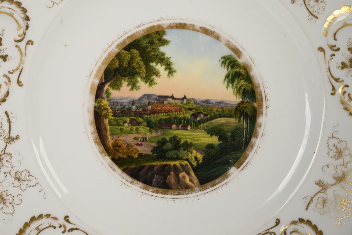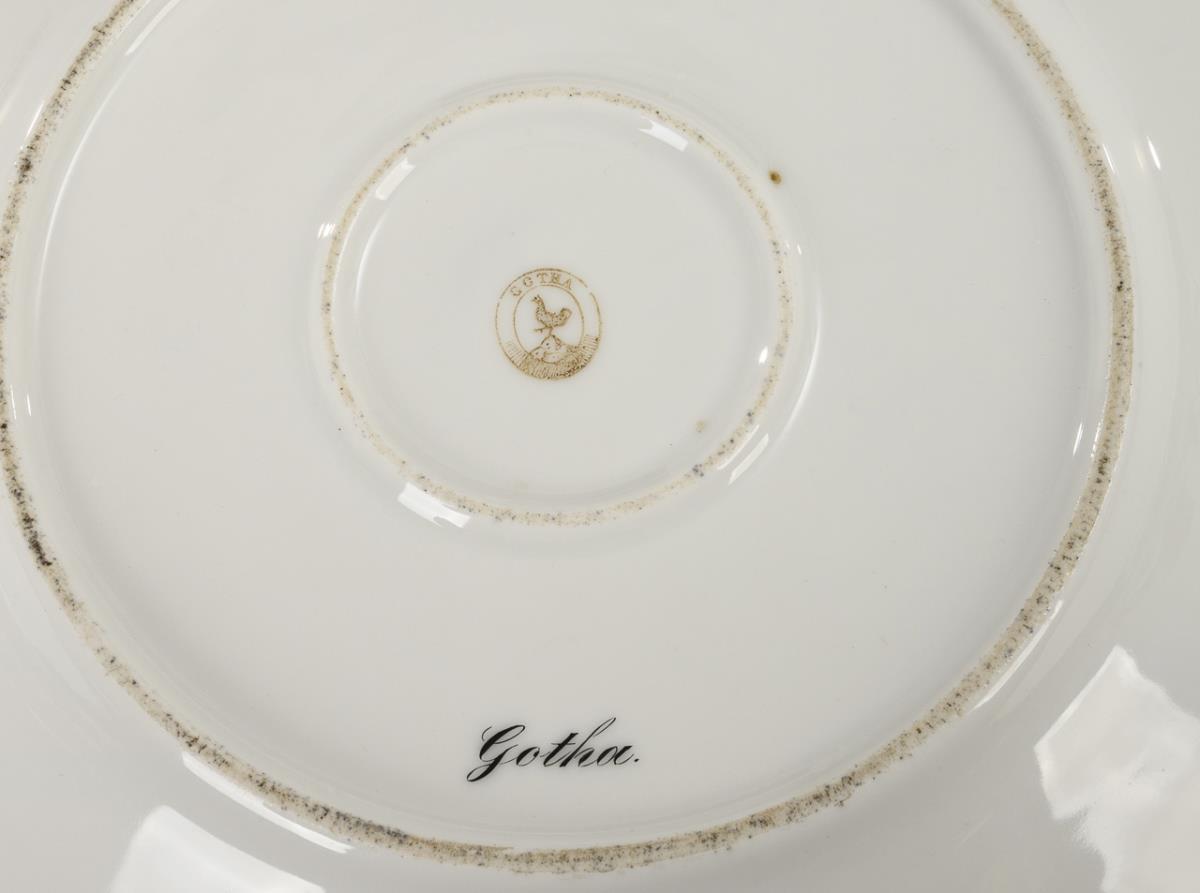 Kredenzteller mit goldstaffiertem Rocaillerelief auf der Fahne, im Spiegel ein Medaillon mit der verso bezeichneten Ansicht der Stadt Gotha. Gold teils berieben.