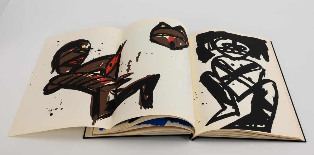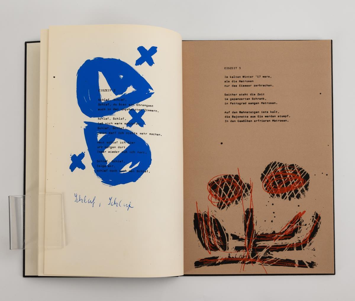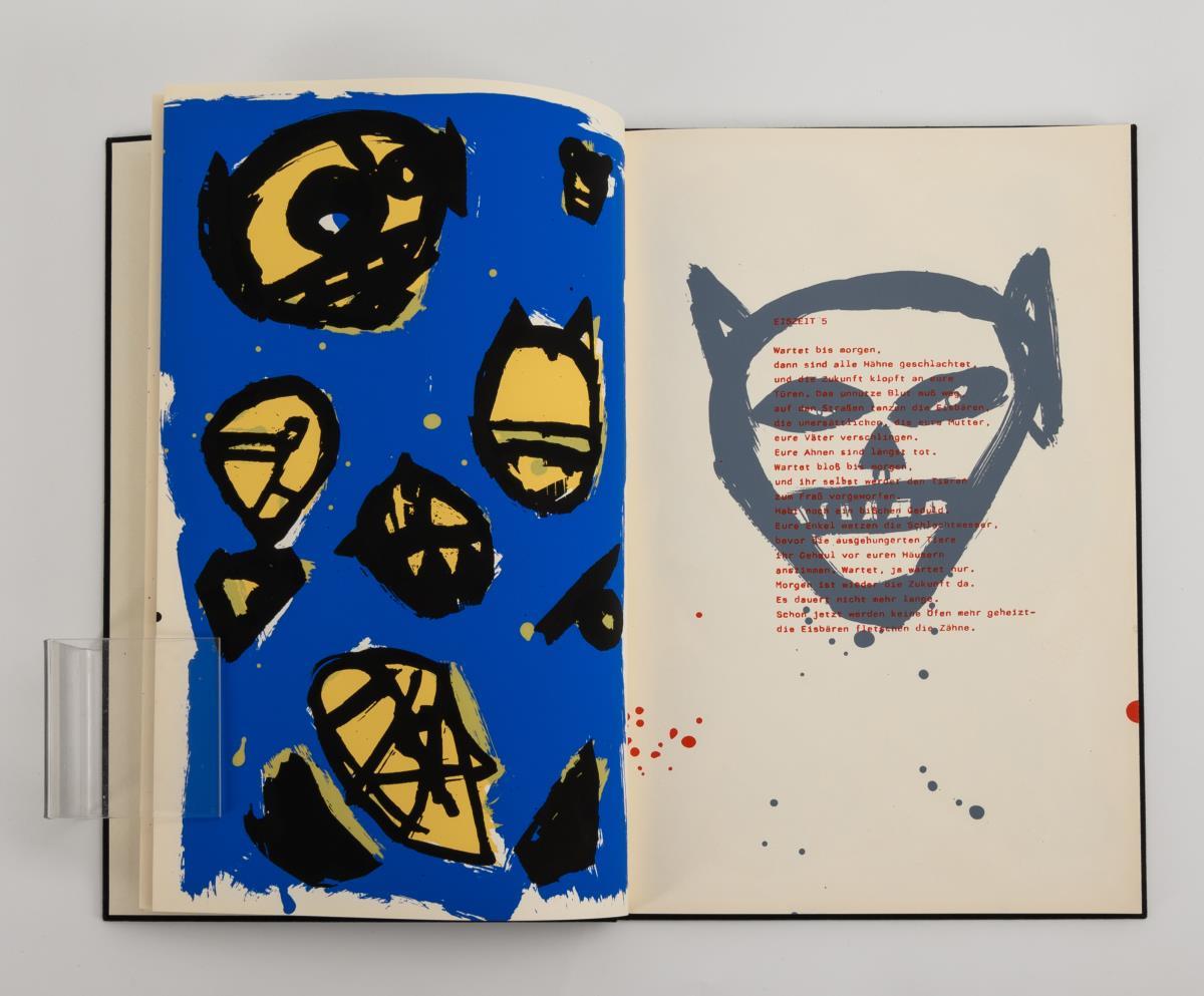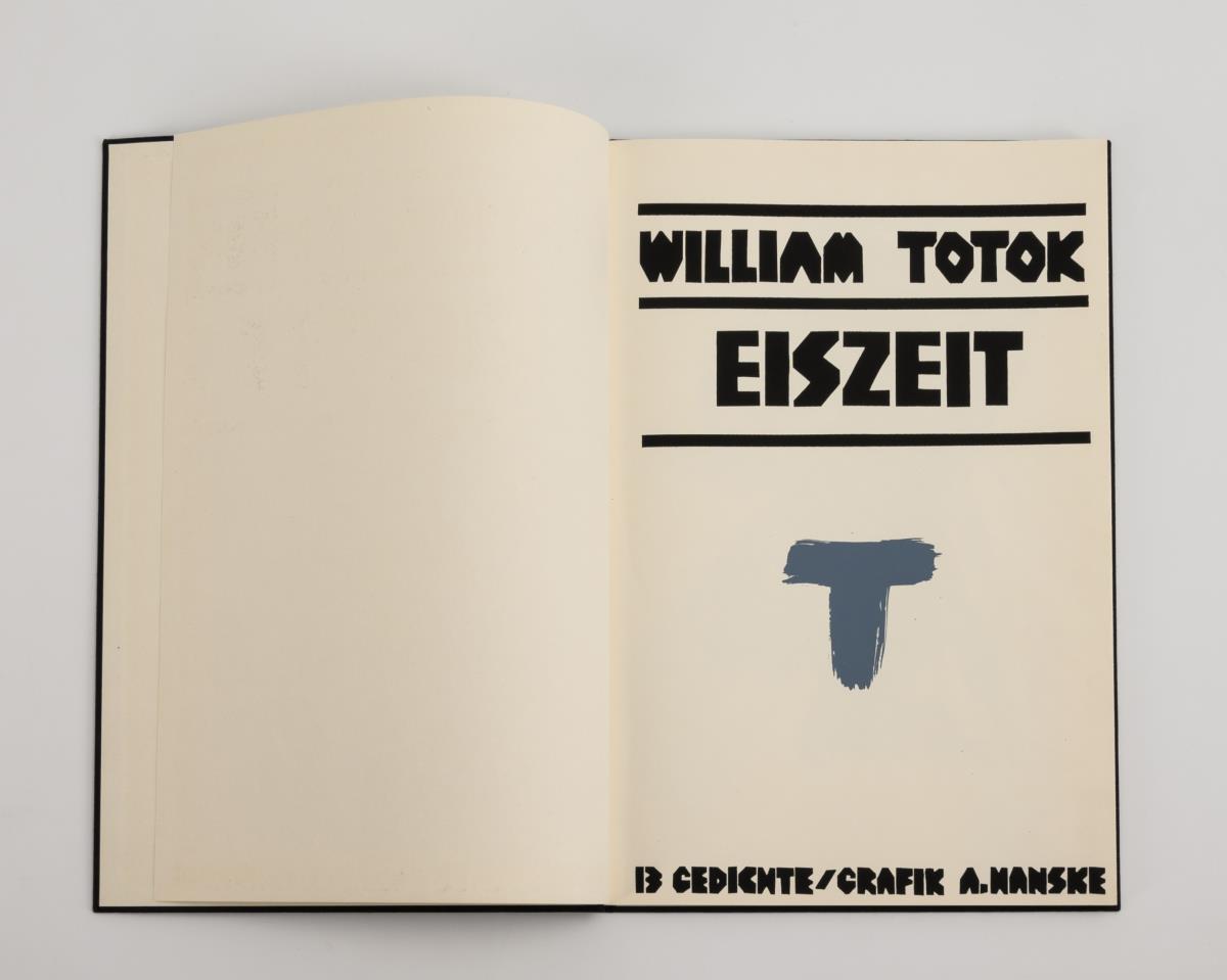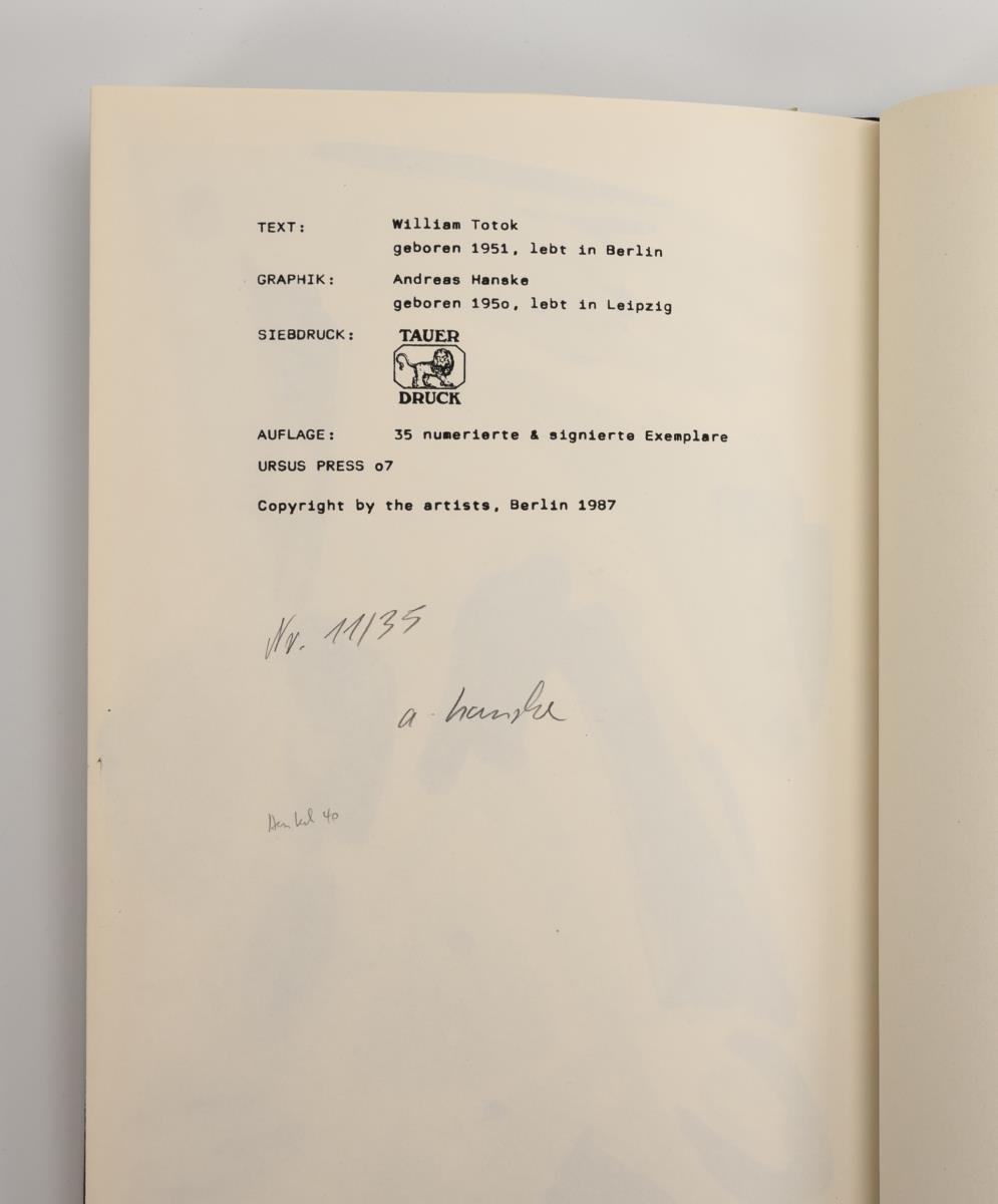 Seltenes Künstlerbuch mit Illustrationen zu den 13 Gedichten von William Totok; in dunkelblauem Leineneinband mit Fadenheftung.