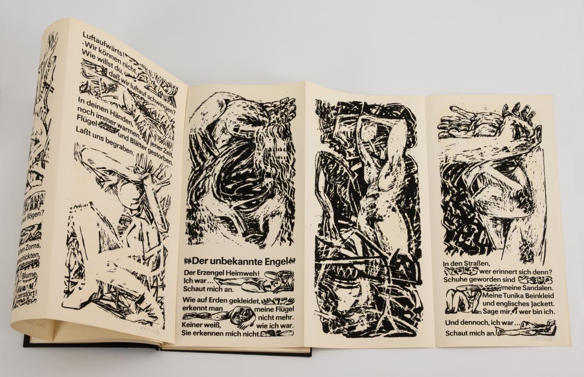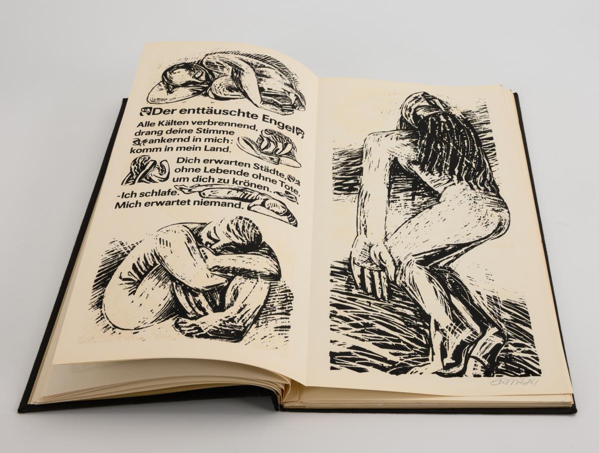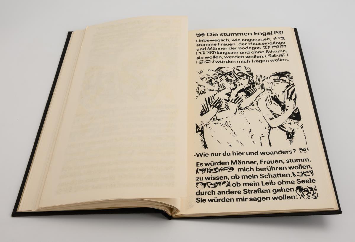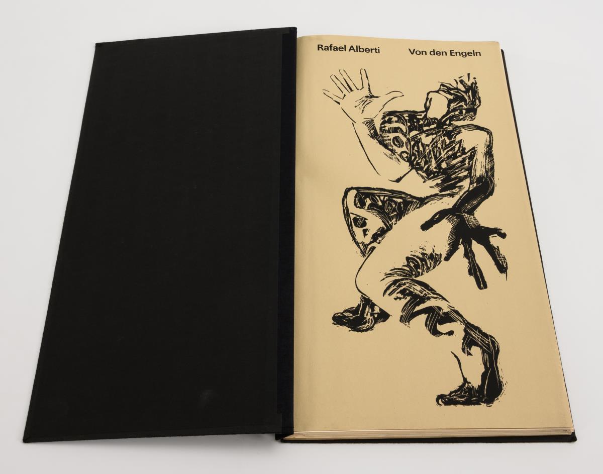 Seltenes Künstlerbuch mit 14 Illustrationen von Elke Riemer zu den Gedichten von Rafael Alberti; in schwarzem Leineneinband mit Fadenheftung, Impressum mit Bleistiftwidmung "Gruß und Freude an Alberti's Engeln ohne Flügel und dem Klipp-Klapp-Buch wünscht Ihnen, sehr verehrter Herr Bromer freundlichst Elke Rieder (Erna)". Ecken mit kleinen Bestoßungen.